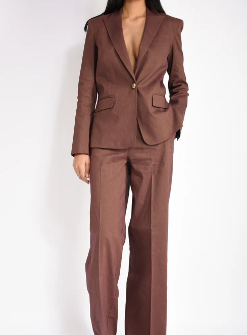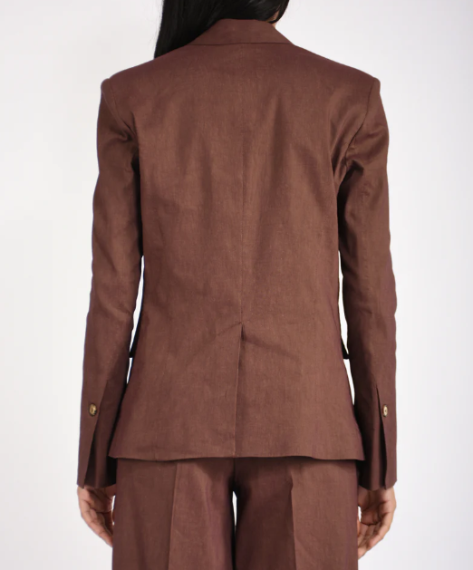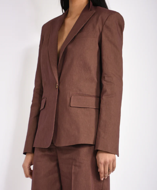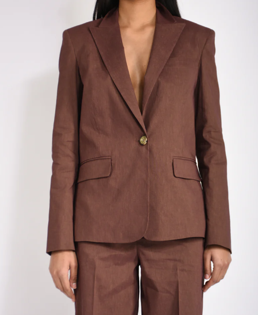 Giacca monopetto con chiusura a un bottone realizzata in misto lino e viscosa stretch dall'armatura a tela, un tessuto fiammato e luminoso che reinterpreta in modo innovativo il classico lino. Il capo è caratterizzato da revers a lancia, due tasche frontali con patta, polsini con bottone e un elegante spacco posteriore. Il modello è foderato per assicurare un maggiore comfort durante l'indosso.