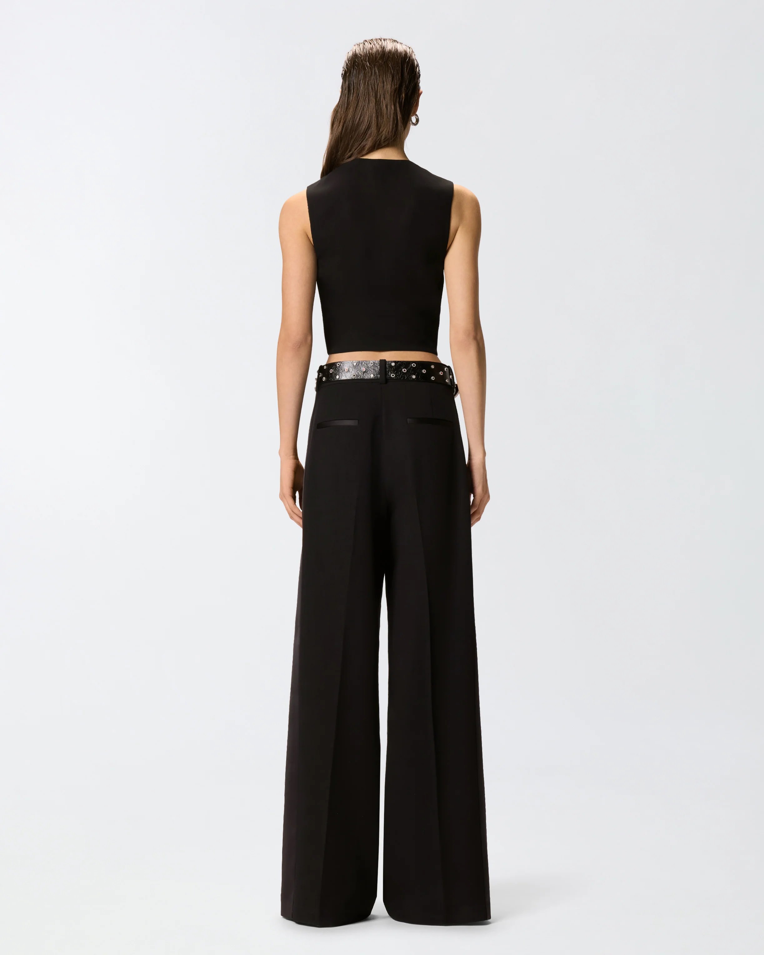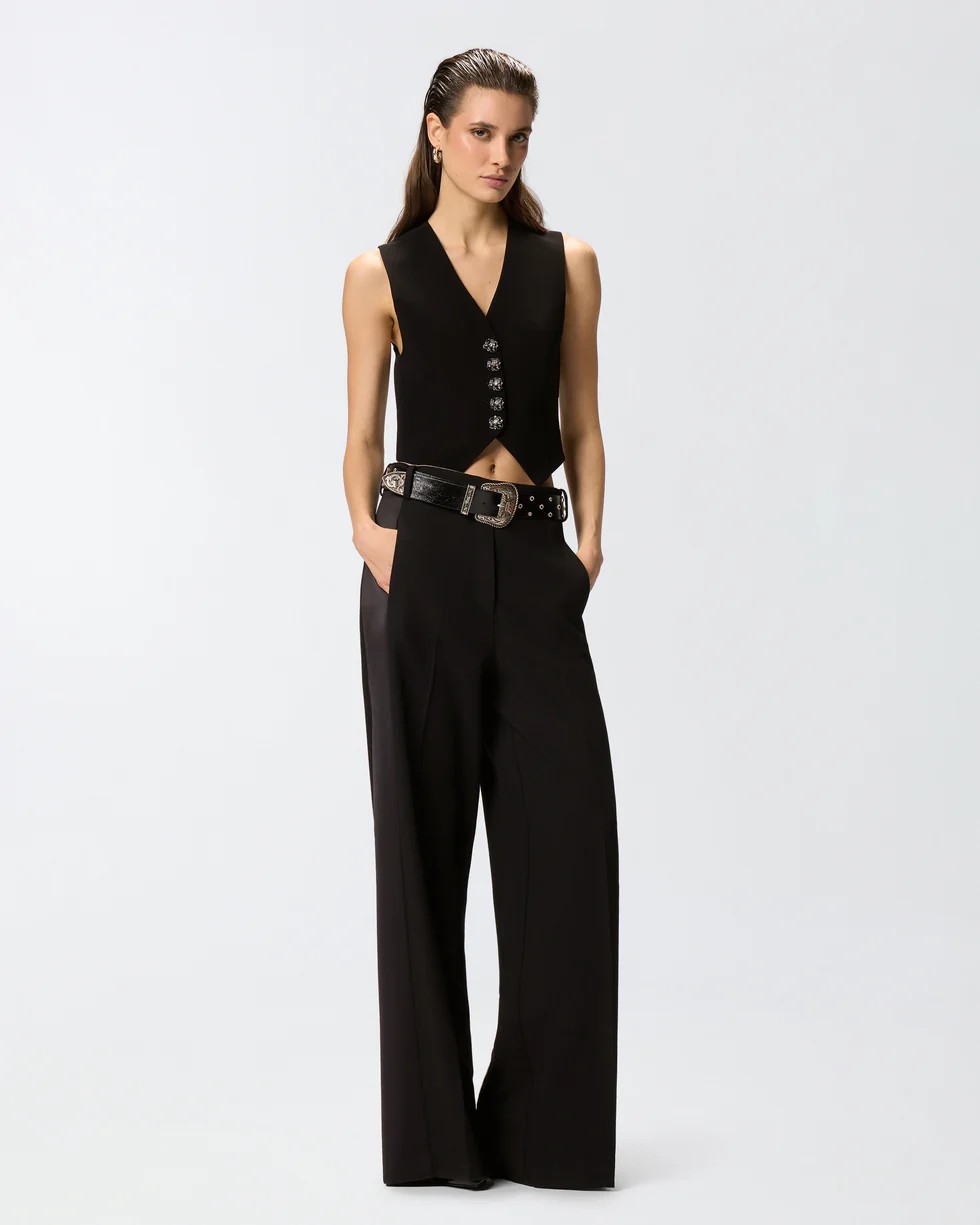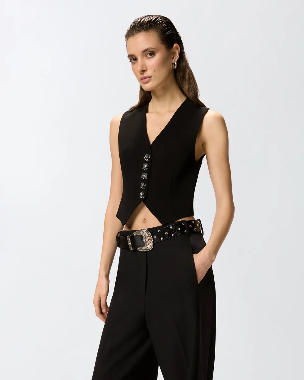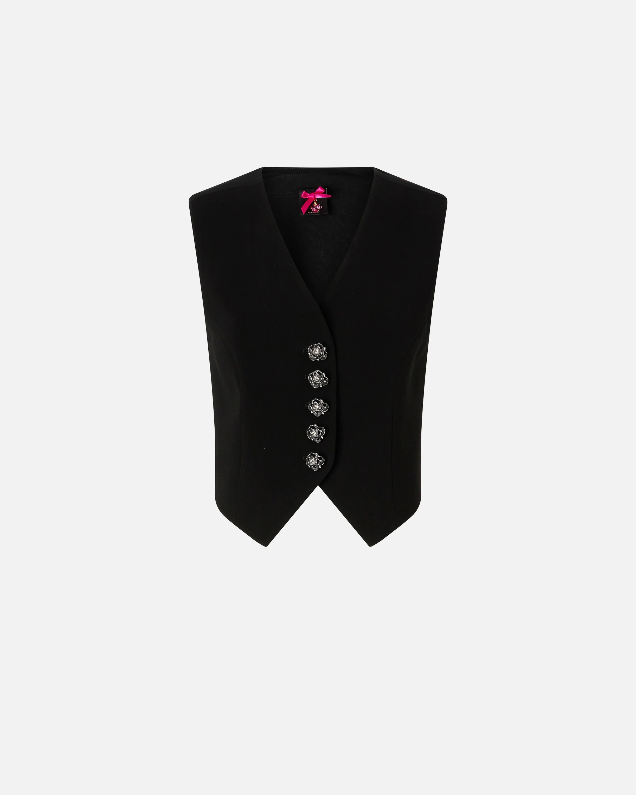 Gilet realizzato in viscosa stretch, tessuto iconico che richiama il classico cady, caratterizzato da una mano morbida e avvolgente che scivola con naturalezza sul corpo, definendo la silhouette con eleganza e offrendo una vestibilità impeccabile. Il modello presenta uno scollo a V e un fondo a doppia punta, e si distingue per il sensuale inserto trasparente sul retro e per la chiusura con bottoni costituiti da un'applicazione gioiello a forma di rosa, in cui ogni petalo è delicatamente intarsiato da luminosi cristalli. Indossalo con una camicia essenziale e pantaloni sartoriali, per un look scintillante anche nelle occasioni più formali. - GIUGGIOLO GILET