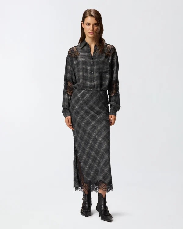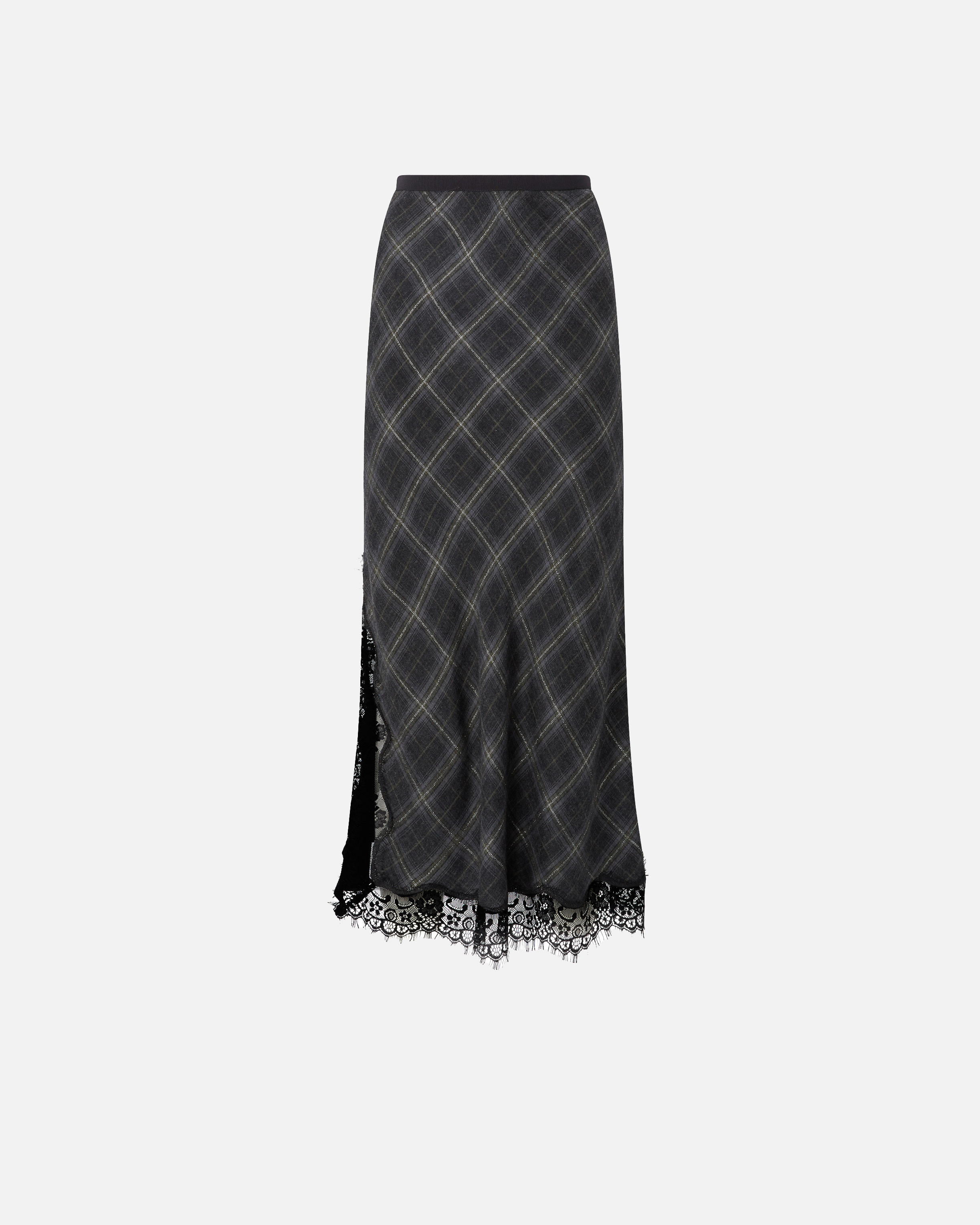 Gonna lunga dalla vestibilità morbida realizzata in un tessuto dalla mano calda e avvolgente che si adatta alle forme del corpo. Il modello, segnato in vita da una fascia elasticizzata, fa da sfondo a un motivo a quadri con filo metallizzato e a sofisticati inserti in pizzo smerlato con intarsio d'ispirazione lingerie sull'orlo e su un lato. Dai la giusta importanza ai tuoi momenti off-duty con questo capo fluido e versatile.