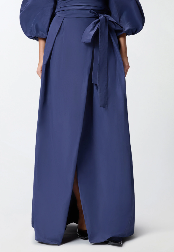 Gonna lunga e ampia realizzata in taffetà, con cintura da annodare a lato sulla vita alta. Il materiale risulta leggero e lucente e si sposa alla perfezione con il volume dinamico che contraddistingue il capo. Indossa questo modello per un effetto fluido e scivolato che esalta con raffinatezza le linee e la silhouette femminile, risultando particolarmente elegante anche per cerimonie e occasioni speciali.