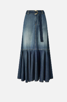Gonna lunga dalla linea leggermente svasata in light denim di cotone e lyocell, caratterizzata da una mano fluida e da lievi scoloriture che donano movimento al tessuto. Il capo presenta una voluminosa balza sul fondo che dà origine a morbide pieghe, ed è dotato di due tasche applicate sul retro, per una nota funzionale, e di una cintura coordinata in vita con doppia fibbia a D da annodare a tuo gusto. Abbraccia la tendenza western e indossa questa gonna insieme a un paio di stivali texani e a una camicia con microfantasia. - GUARDIANO GONNA