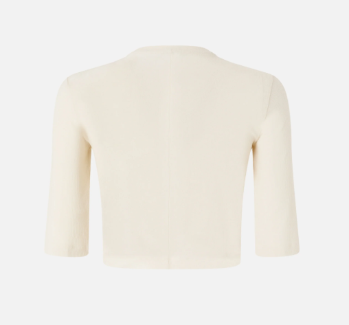 Maglia dal taglio cropped realizzata in crêpe di puro cotone lavorato a costine. Il capo, con maniche al gomito, è arricchito da una collana con catena dorata per conferire al tuo look un prezioso tocco di luminosità. Pratico, originale e dallo stile unico: questo modello è destinato a diventare un vero e proprio passe-partout.
