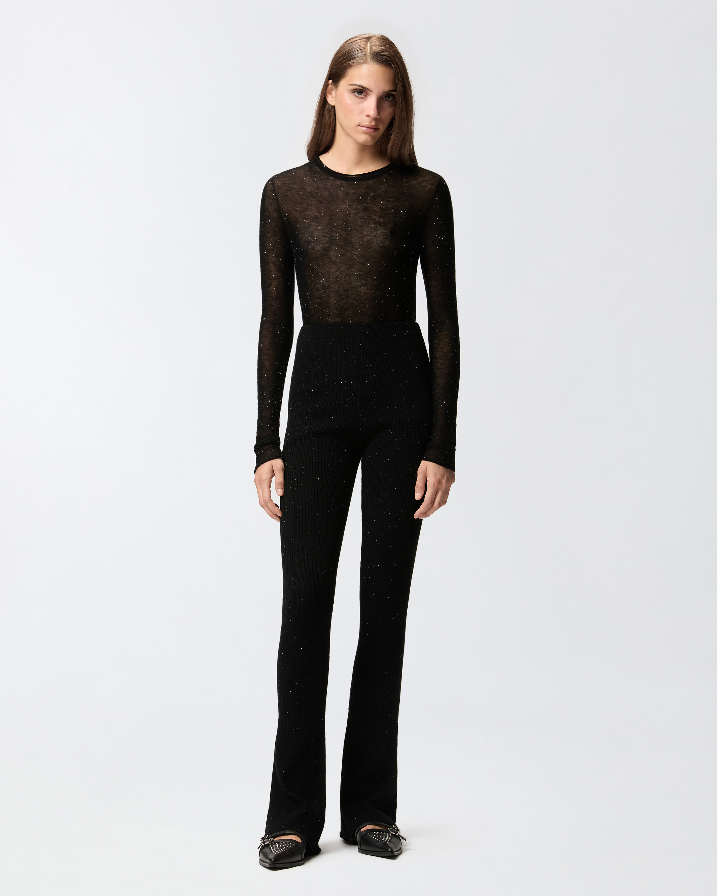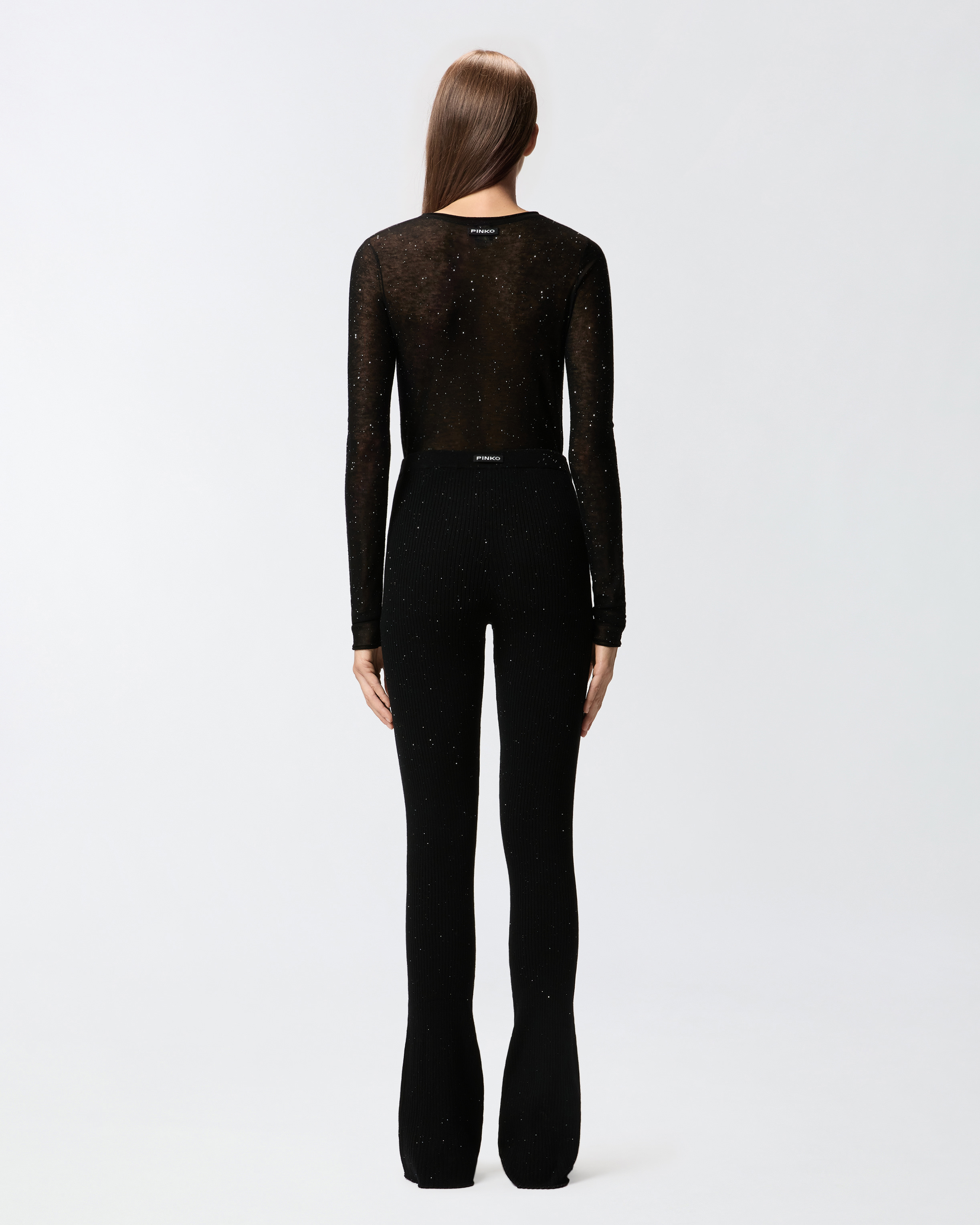 Maglia girocollo realizzata in misto lana semitrasparente: un filato leggero e morbido, quasi impalpabile, che contribuisce a creare un look sensuale e appariscente. Il design è impreziosito da micro paillettes inserite nel filo e riesce nell'impresa di risultare luminoso e al tempo stesso essenziale e molto comodo all'indosso. Il capo è stato sottoposto a prove di finissaggio per ridurre al minimo la possibile formazione di pilling, garantendo una maggiore morbidezza e durabilità del tessuto. Il tocco finale è dato dall'etichetta con logo lettering PINKO sul retro.