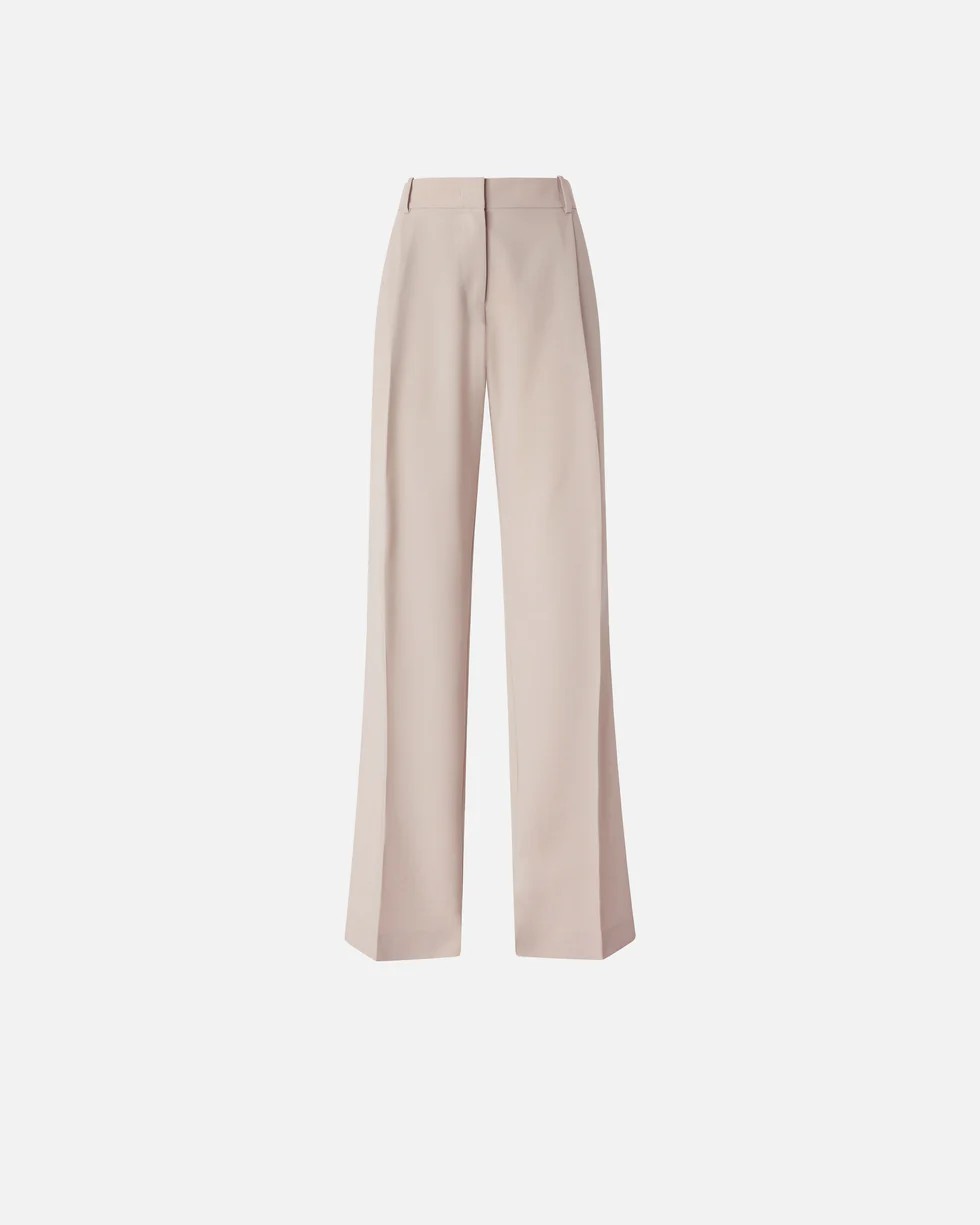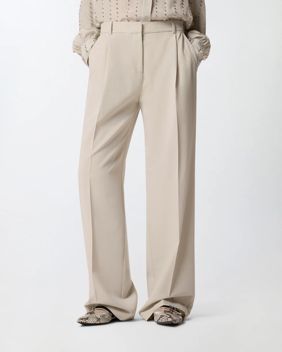 Pantaloni a gamba dritta realizzati in un tessuto di misto viscosa stretch dalla mano fluida. Il capo si distingue per la raffinata piega stirata lungo la gamba e le due tasche a filetto sul retro, ed è completato da una chiusura nascosta con zip e gancio interno. Abbina questi pantaloni con la giacca coordinata per un total look elegante, oppure indossali con un top più casual per un outfit spezzato.