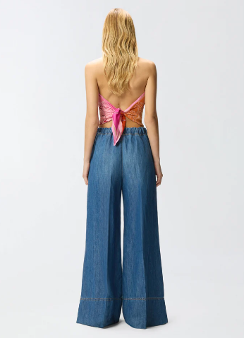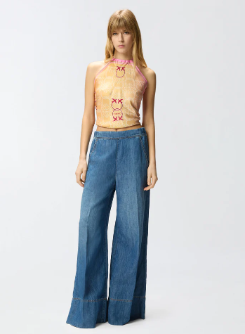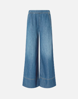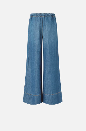 Jeans a gamba larga e leggermente svasata, realizzati in denim misto cotone e lino, leggero e confortevole, con trattamento stone-wash che crea un effetto vintage. Questo modello è dotato di una cerniera laterale invisibile per facilitarne la calzata.