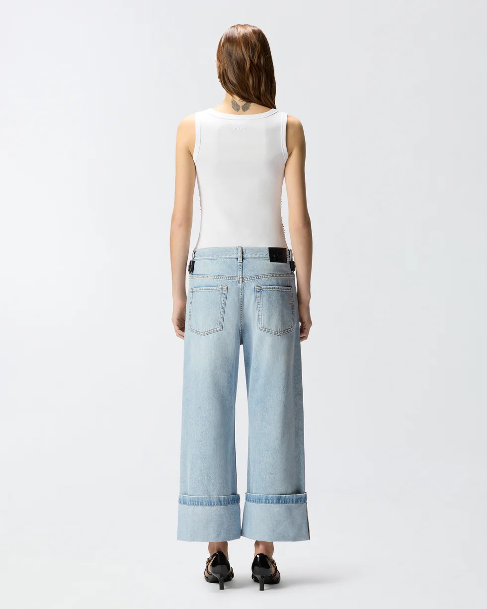 Jeans cinque tasche realizzati in denim di cotone e lyocell dalla mano morbida con leggere scoloriture per un delicato effetto vissuto. Il modello è caratterizzato da una lunghezza cropped con fondo risvoltato fisso e una cintura rimovibile realizzata in vera pelle e impreziosita da borchie. Il design con cintura rimovibile e doppio set di passanti per cintura a due diverse altezze consente di portare i jeans in tre modi diversi: senza cintura per un look più pulito e relaxed, a vita alta con cintura stretta per un effetto caramella, oppure con cintura regolata sul fianco per ottenere una vestibilità loose a vita bassa.