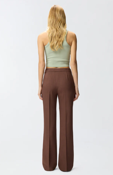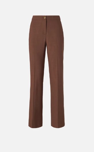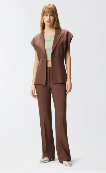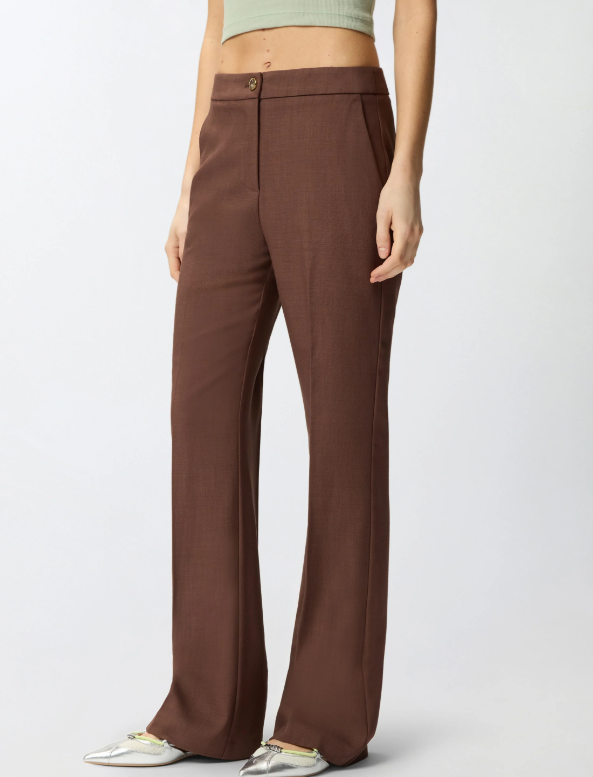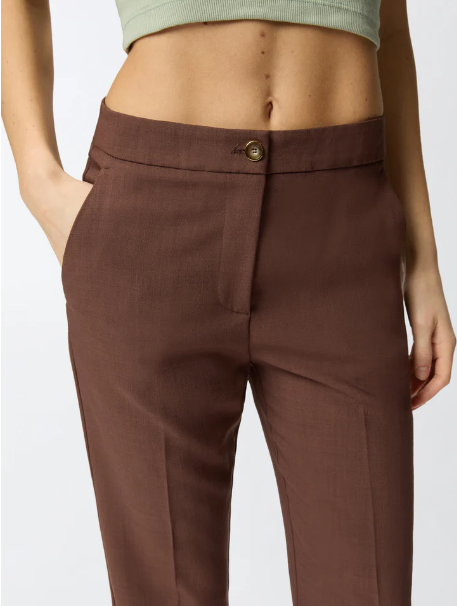 Pantaloni leggermente svasati con raffinate pieghe stirate lungo le gambe e due comode tasche laterali. Il capo è realizzato in tela di misto viscosa frisottina, un tessuto il cui filato appositamente ritorto crea una superficie irregolare, quasi testurizzata, e si chiude con una zip nascosta e un bottone a vista sul davanti. Questi pantaloni sono perfetti da indossare in ufficio con il blazer coordinato o ovunque si desideri aggiungere un tocco di raffinatezza, abbinati a una camicia o un top femminile.