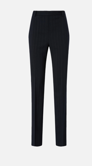 Pantaloni a gamba dritta con chiusura frontale nascosta. Il modello è realizzato in un classico tessuto gessato in lana poly caratterizzato da un cambio di tessitura e di luce a sottolineare il disegno del materiale. Il design sartoriale del capo è ulteriormente evidenziato dalle pinces, dalla costruzione della vita con passanti per cintura e dal taschino a filetto sul retro. Abbina i pantaloni con il blazer nello stesso tessuto per un effetto tailleur, oppure indossa una camicia per un look formale, ma non troppo.
