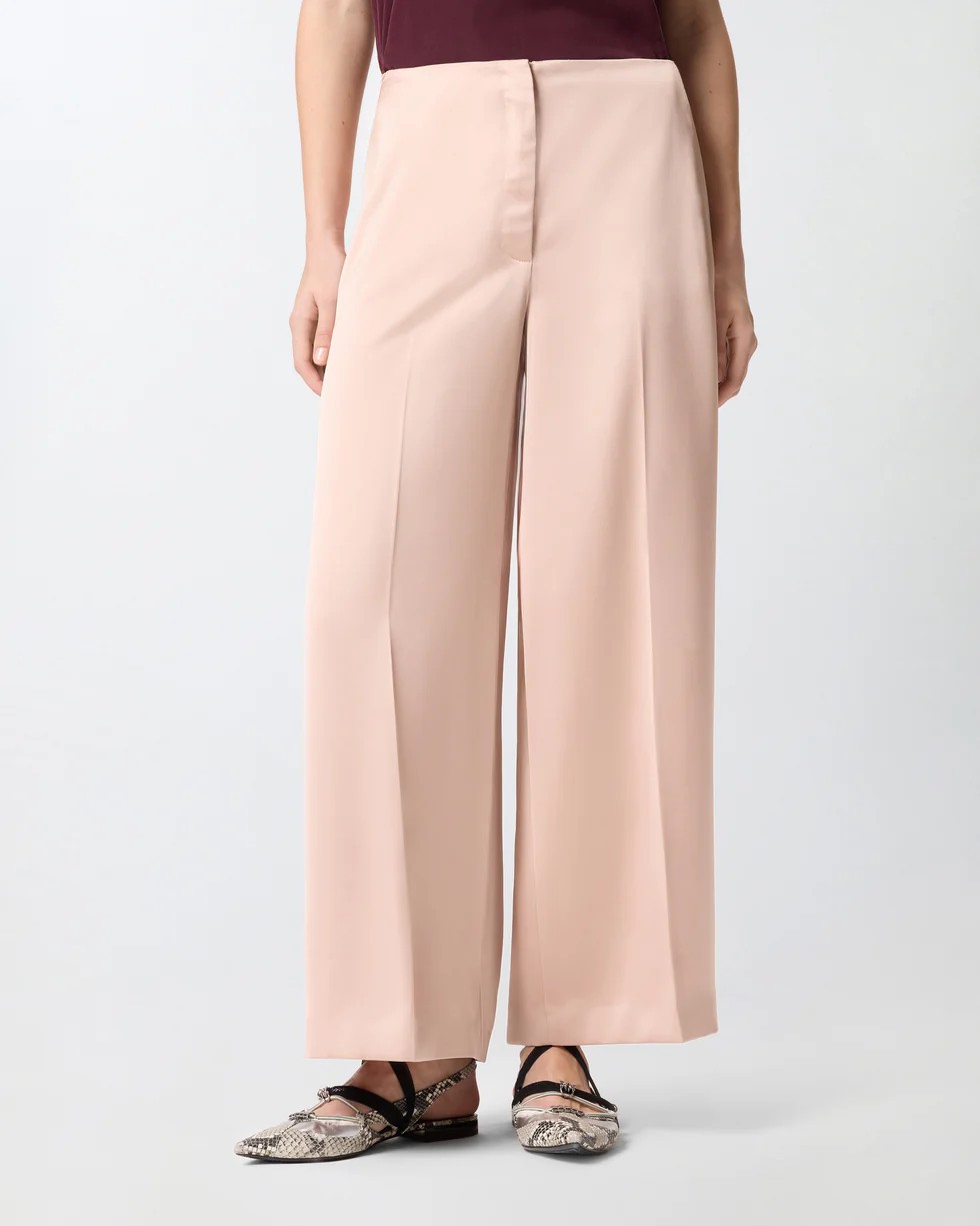 Pantaloni realizzati in morbido e luminoso raso double-face per un look raffinato e uniforme sia all'interno che all'esterno. Questo capo fluido è completato da chiusura con zip e gancio nascosti, due tasche laterali, due tasche posteriori a filetto ed eleganti pinces stirate.