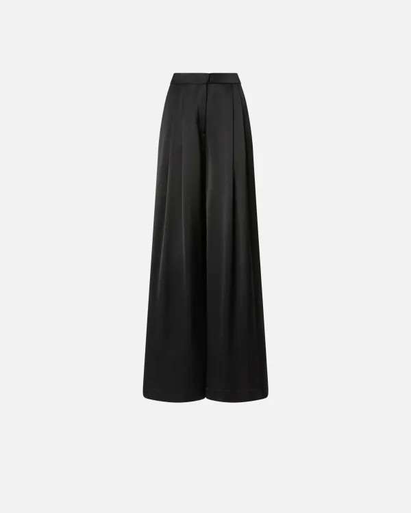 Pantaloni palazzo con orlo particolarmente ampio, impreziositi da doppie pinces e funzionali tasche a filetto sul retro. Il raso lucido conferisce al capo una lucentezza unica e una mano particolarmente morbida. Indossa questo modello per un effetto fluido e sinuoso che esalta con eleganza le linee e la silhouette femminile.