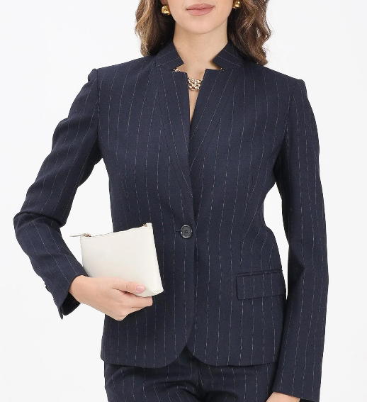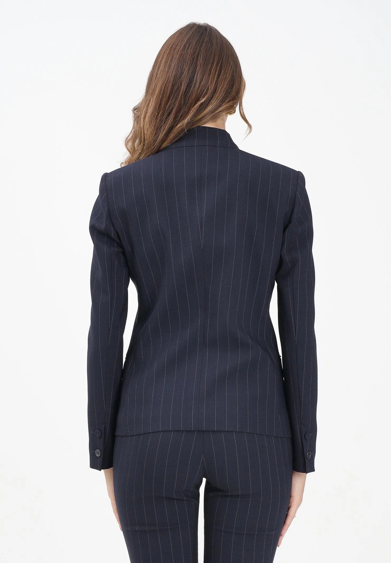 PINKO Giacca monopetto blu da donna dal taglio maschile rivisitata con una vestibilità sfiancata, più aderente sul punto vita, di stampo più femminile. Il tessuto utilizzato è un classico gessato in lana poly caratterizzato da un cambio di tessitura e di luce a sottolineare il disegno del materiale. Il design, oltre a presentare elementi più classici come le tasche con pattina e la chiusura monopetto, si distingue per il il particolare collo a revers alzato, per un tocco innovativo in puro stile PINKO. Abbina la giacca al pantalone nello stesso tessuto per creare un completo elegante e al tempo stesso contemporaneo. La modella indossa una taglia 40 ed è alta 170cm. Si consiglia una stiratura a media temperatura. Stagione autunno inverno.