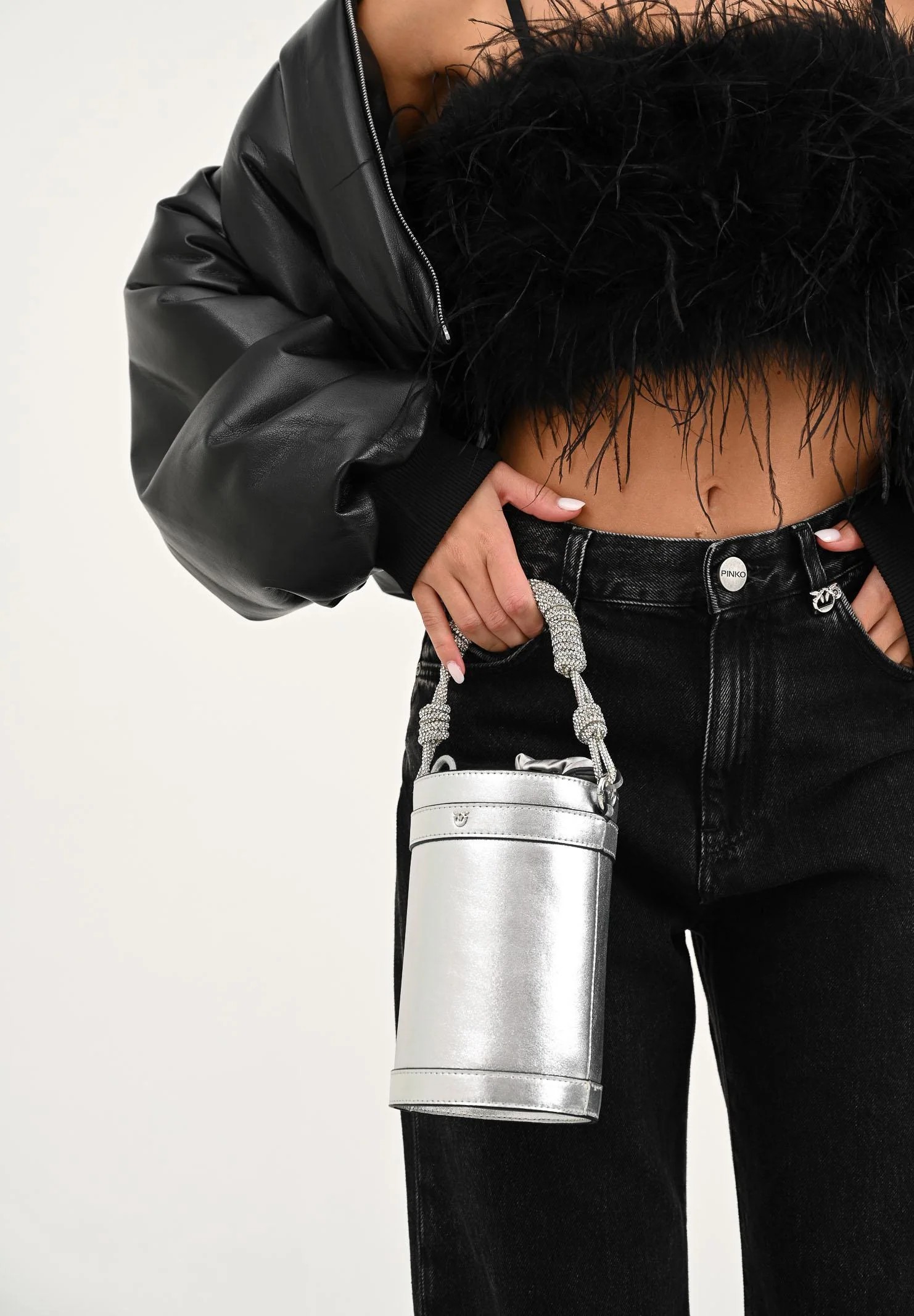 PINKO Mini bucket argento da donna. La sua silhouette strutturata la rende un accessorio originale e sofisticato, mentre il manico corto, interamente ricoperto di micro-cristalli intrecciati, dona un'allure gioiello che cattura la luce a ogni movimento. È dotata anche di una pratica tracolla regolabile e removibile, che consente di portarla comodamente a spalla o crossbody, mantenendo sempre un'eleganza raffinata. Il piccolo logo frontale tono su tono aggiunge un dettaglio discreto ma riconoscibile. Una borsa scenografica e versatile, pensata per chi ama distinguersi con stile nelle occasioni speciali. Altezza: 19cm. Larghezza: 11,5cm. Profondità: 10cm. Stagione autunno inverno.