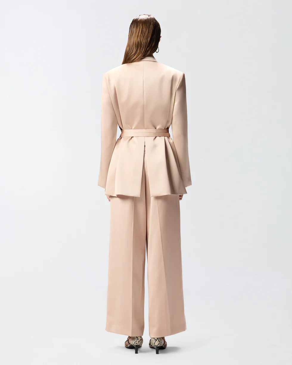 Giacca dalla linea fluida e scivolata realizzata in morbido e lucente satin double face, per un aspetto raffinato e uniforme sia all'esterno sia all'interno. Il capo presenta revers classici, raffinati spacchi sul retro e sulle maniche, due tasche a doppio filetto sul davanti e una tasca a filettone sul petto, ed è completato da una doppia cintura sottile da annodare in vita. Il modello è foderato per assicurare un maggiore comfort durante l'indosso. Indossa questa giacca con i pantaloni coordinati per creare un total look femminile ideale per le occasioni formali.