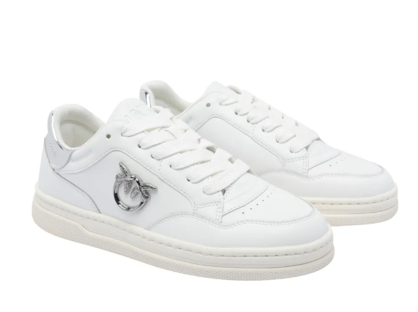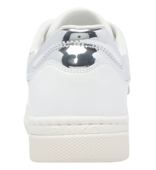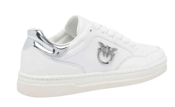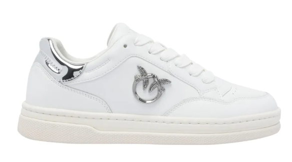 Le sneakers Mandy di Pinko in pelle con inserti di colore platinum. Logo Love Birds Monogram in tessuto nella parte laterale.