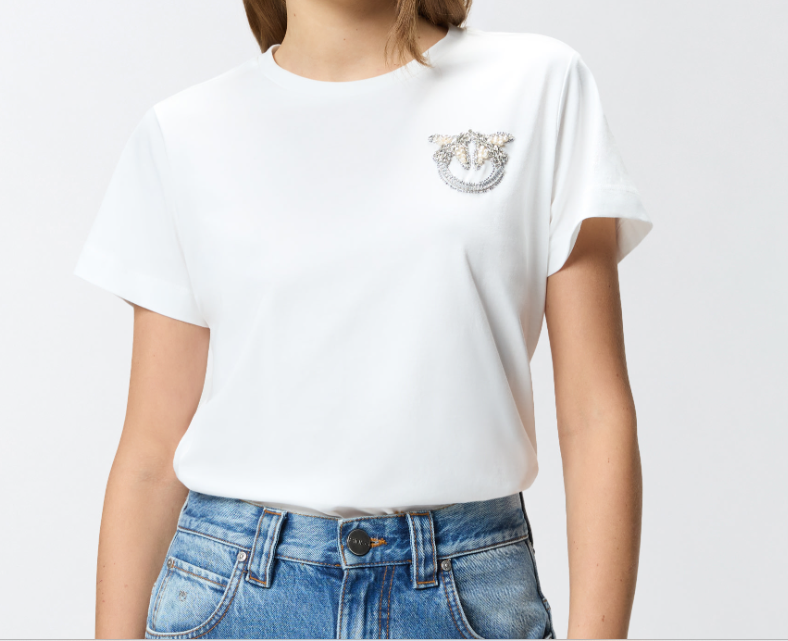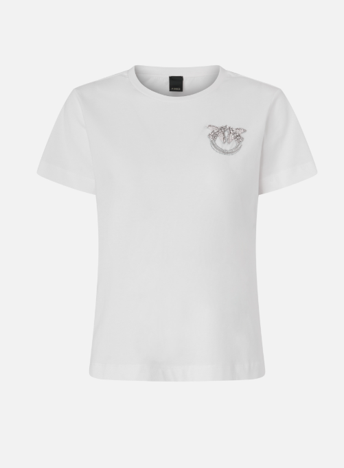 T-shirt in jersey di puro cotone con scollo tondo e maniche corte. Cristalli e perle di colore e forma differenti donano un tocco di eleganza raffinata al logo Love Birds presente sul davanti lato cuore e rifiniscono questo capo con un prezioso tocco artigianale. Questa t-shirt si abbina con facilità ai tuoi pantaloni preferiti, elevando il tuo look in modo semplice, elegante e originale.