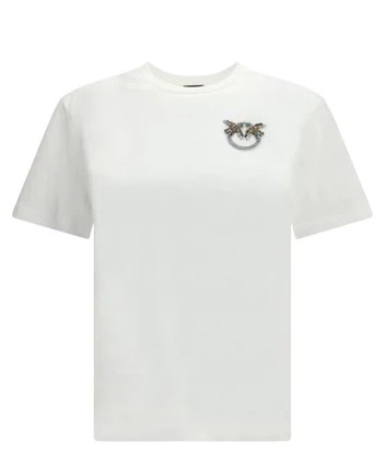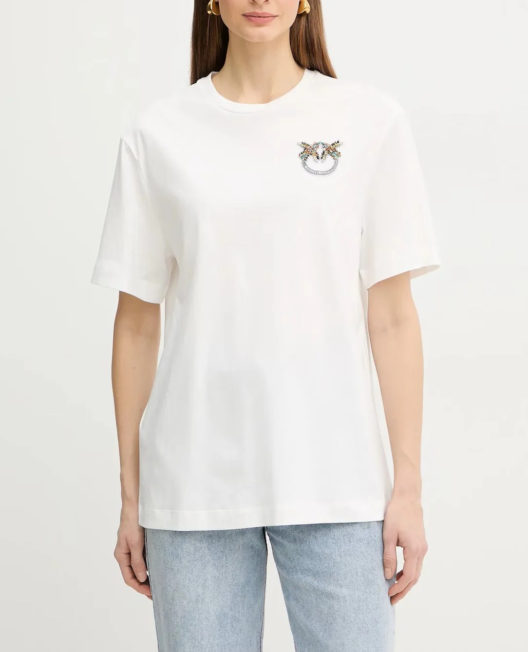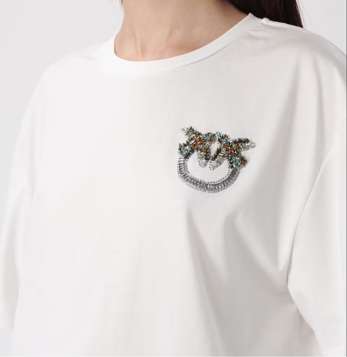 La T-shirt è realizzata in cotone, personalizzata con logo sul petto con applicazioni di strass.