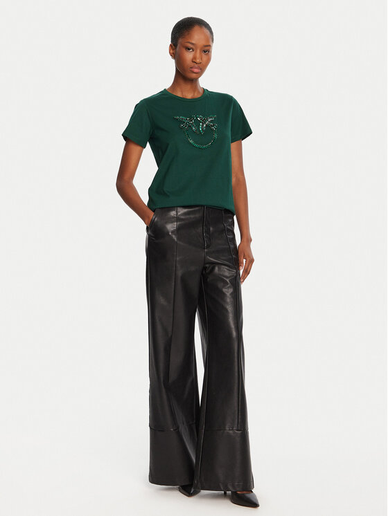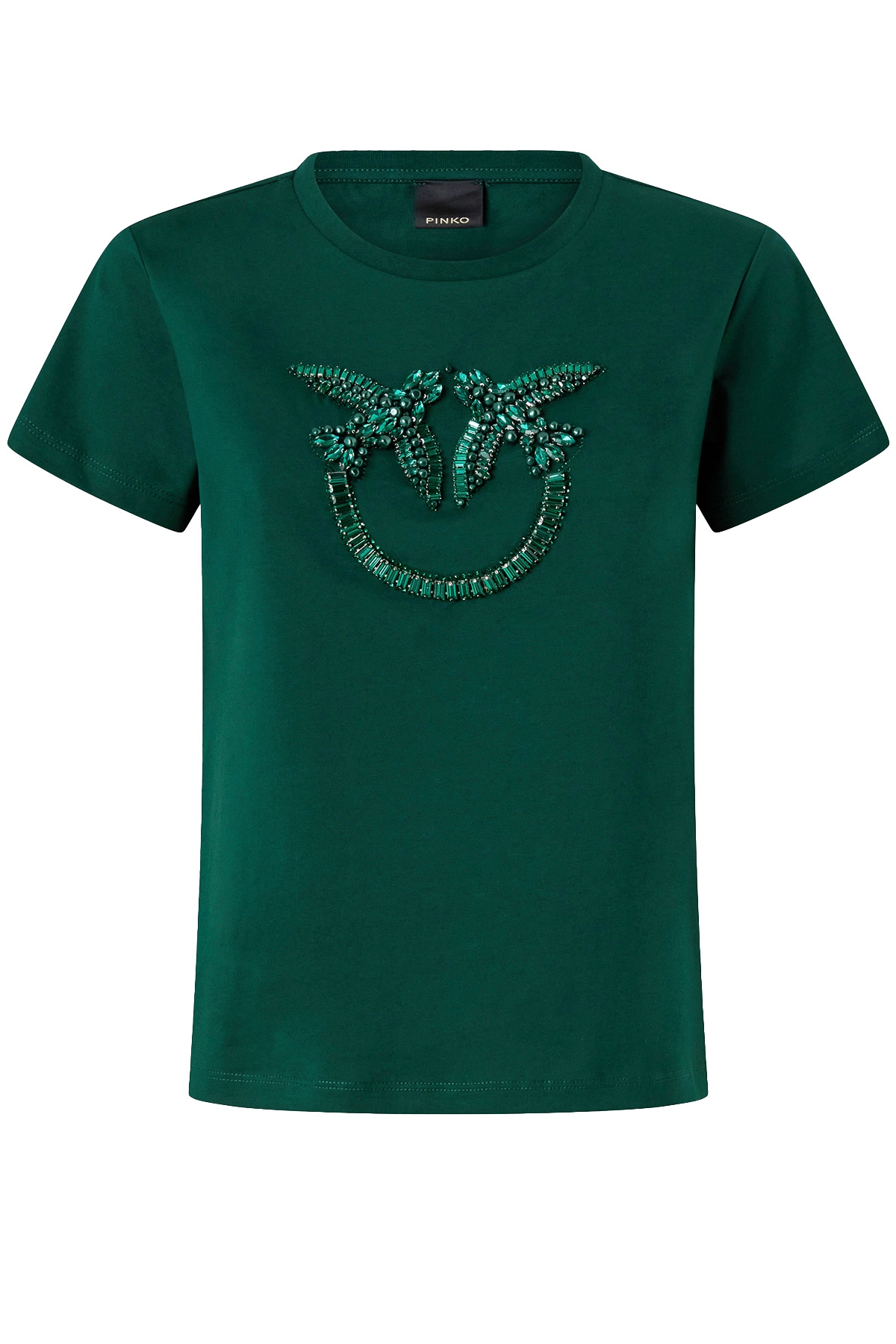T-shirt a maniche corte in jersey di cotone. Il capo è impreziosito dal logo Love Birds decorato da un ricamo realizzato a mano composto di perle, catenina di cristalli con taglio baguette e strass di diversa forma fissati con apposite alette laterali per renderli più saldi. Questa maglietta è perfetta da indossare in qualunque occasione, dalle più formali alle più sporty, per un tocco femminile e iconico.