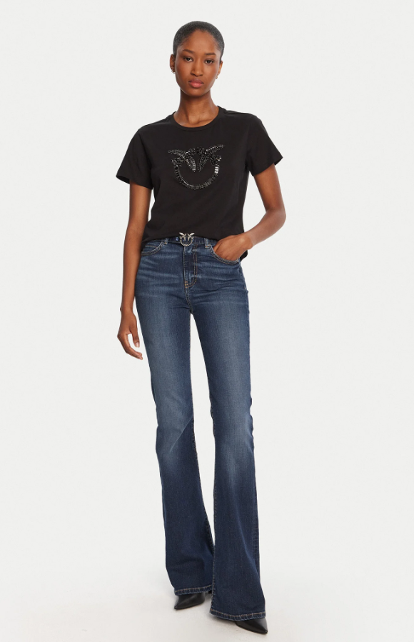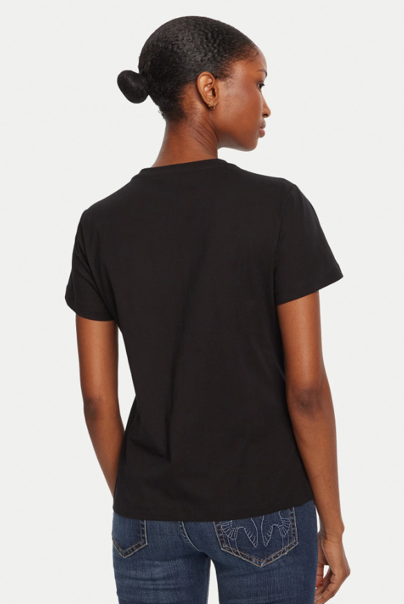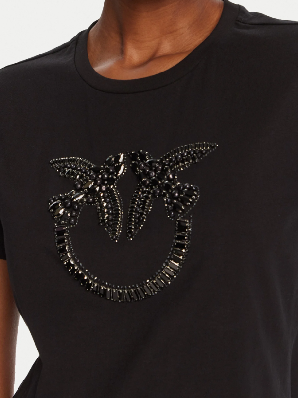 T-shirt a maniche corte in jersey di cotone. Il capo è impreziosito dal logo Love Birds decorato da un ricamo realizzato a mano composto di perle, catenina di cristalli con taglio baguette e strass di diversa forma fissati con apposite alette laterali per renderli più saldi. Questa maglietta è perfetta da indossare in qualunque occasione, dalle più formali alle più sporty, per un tocco femminile e iconico.