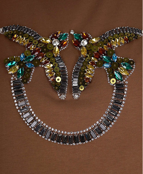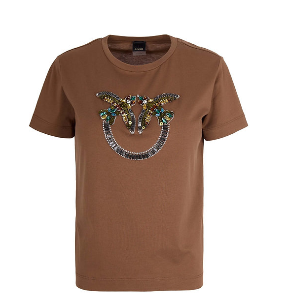 T-shirt in jersey con ricamo con strass pailettes e pietre cammello Pinko