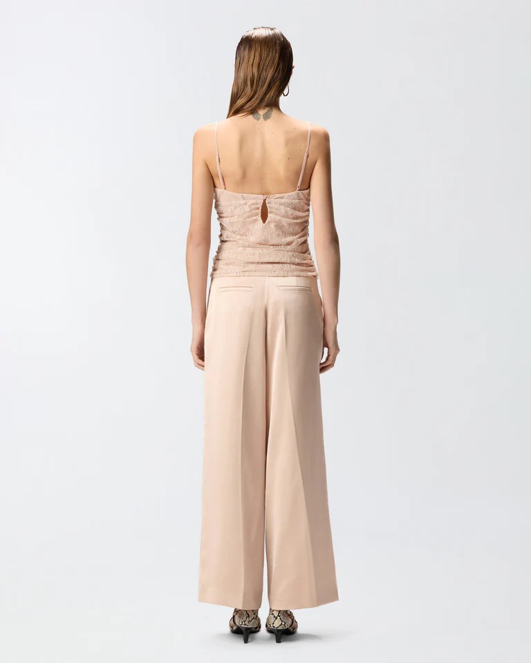 Top senza maniche dalla silhouette aderente, caratterizzato da sottili spalline regolabili ispirate alla lingerie, scollo a V frontale e chiusura posteriore con due bottoni tono su tono che creano piccoli cut-out. Protagonista indiscusso del modello, però, è il dettaglio: un pizzo leggerissimo che impreziosisce l'intera superficie con raffinati motivi floreali e rifinisce il bordo esterno della scollatura frontale. Il capo, foderato per renderlo ancora più confortevole da indossare, presenta inoltre delicati drappeggi che esaltano la figura e una scollatura dritta sul retro che lascia scoperta la parte superiore della schiena: indossalo con una minigonna per un look più audace, oppure abbinalo a un pantalone e un blazer per un outfit raffinato e un pizzico di sensualità.