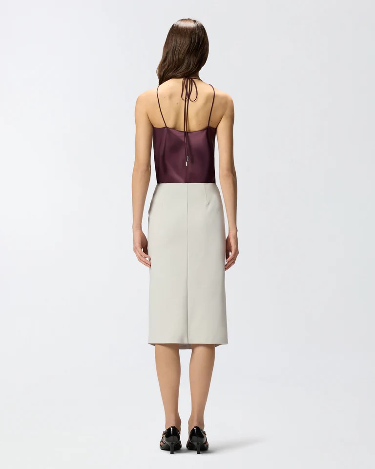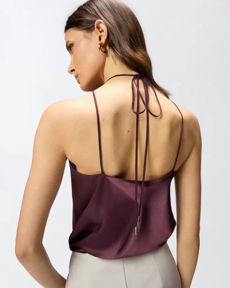 Top dalla linea linea morbida e scivolata, caratterizzato da uno scollo all'americana con coulisse regolabile completata da finalini metallici che crea raffinati arricci sul davanti e lascia la parte alta della schiena scoperta. Il modello è realizzato in morbido e lucente satin double face, per un aspetto raffinato e uniforme sia all'esterno sia all'interno, e presenta spalline sottili coordinate alla coulisse da indossare sia a vista sia nascoste. La fluidità di questo capo saprà stupirti per le cerimonie e occasioni speciali, soprattutto in total look con il pantalone abbinato.