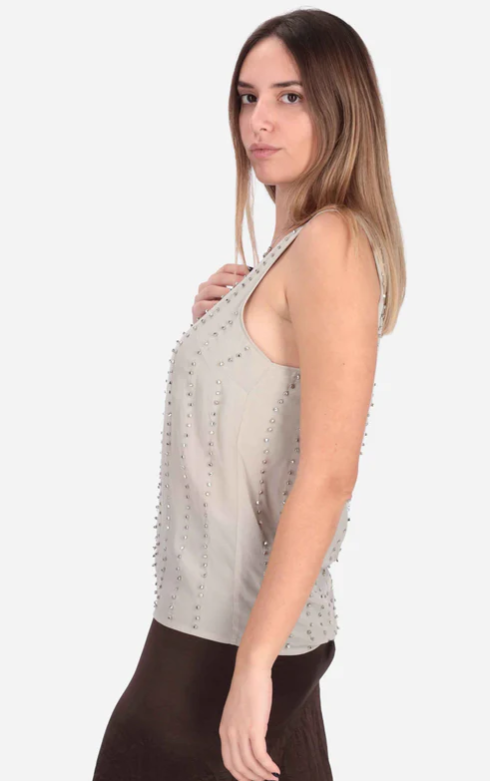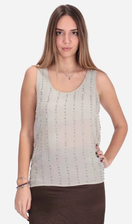 Presenta applicazione di strass all over, girocollo ampio e senza maniche.