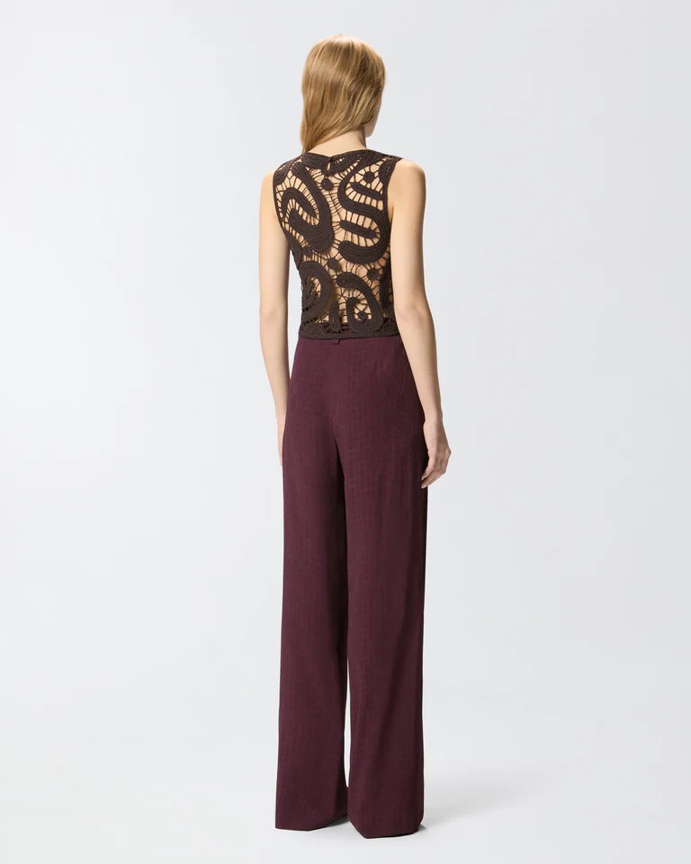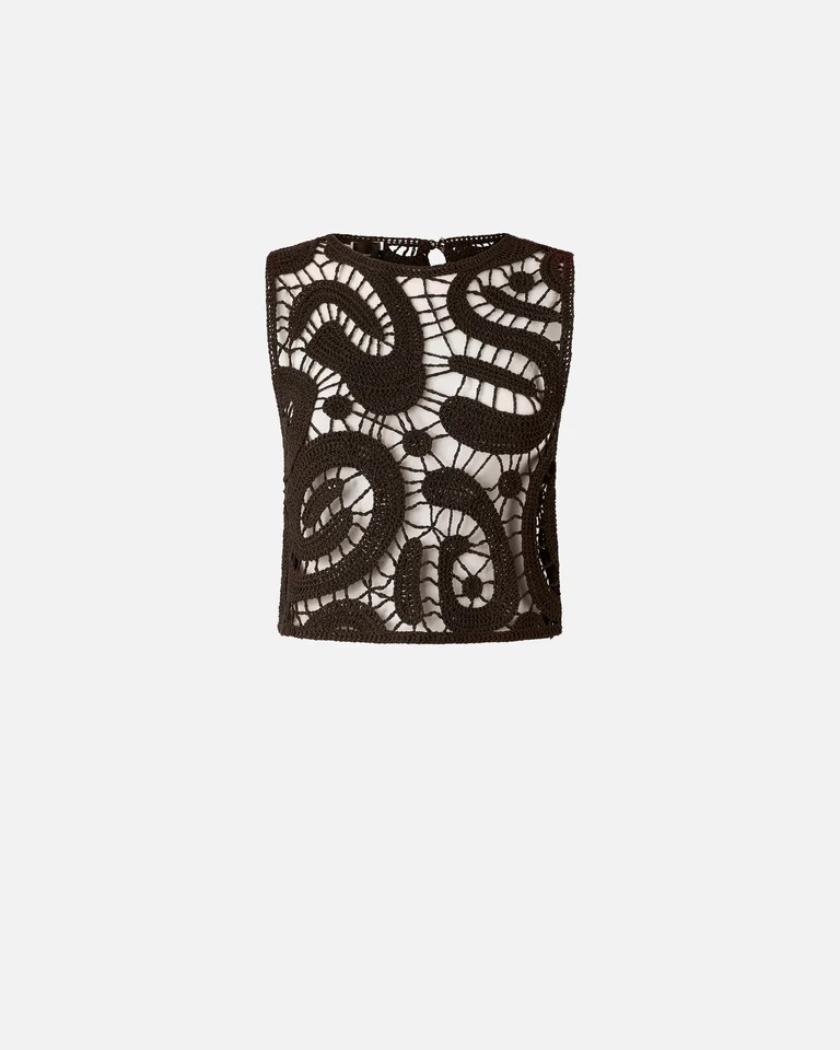 Top smanicato dal taglio corto caratterizzato da una raffinata lavorazione crochet con un innovativo motivo geometrico che dona dinamismo al design e crea un effetto vedo non vedo. Regala un tocco di unicità ai tuoi look con questo capo dallo stile contemporaneo e femminile.