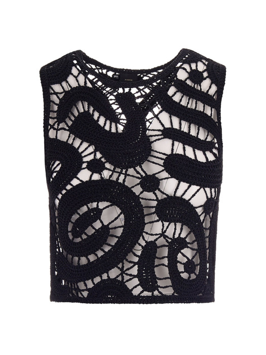 Top smanicato dal taglio corto caratterizzato da una raffinata lavorazione crochet con un innovativo motivo geometrico che dona dinamismo al design e crea un effetto vedo non vedo. Regala un tocco di unicità ai tuoi look con questo capo dallo stile contemporaneo e femminile.