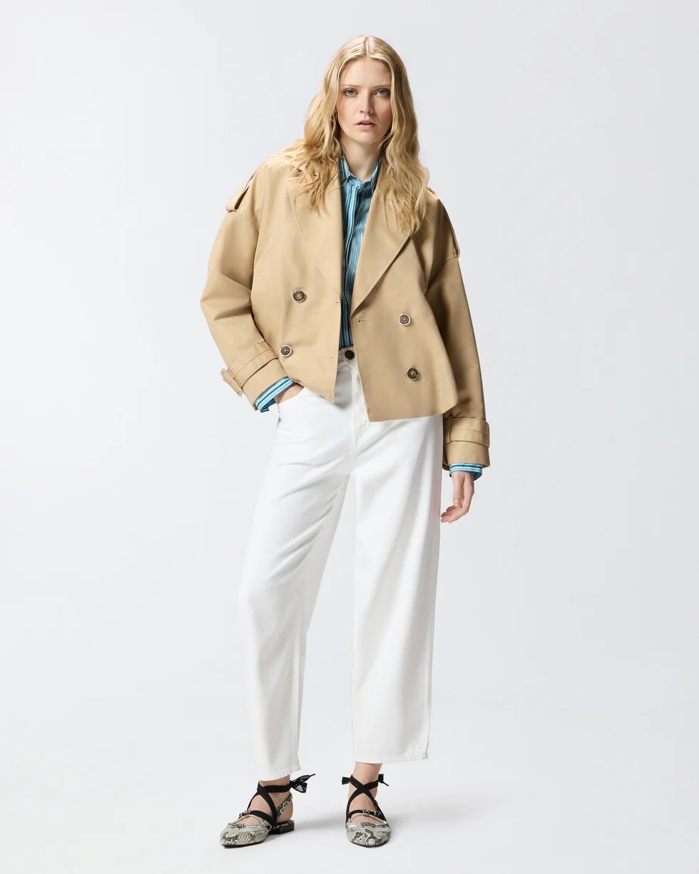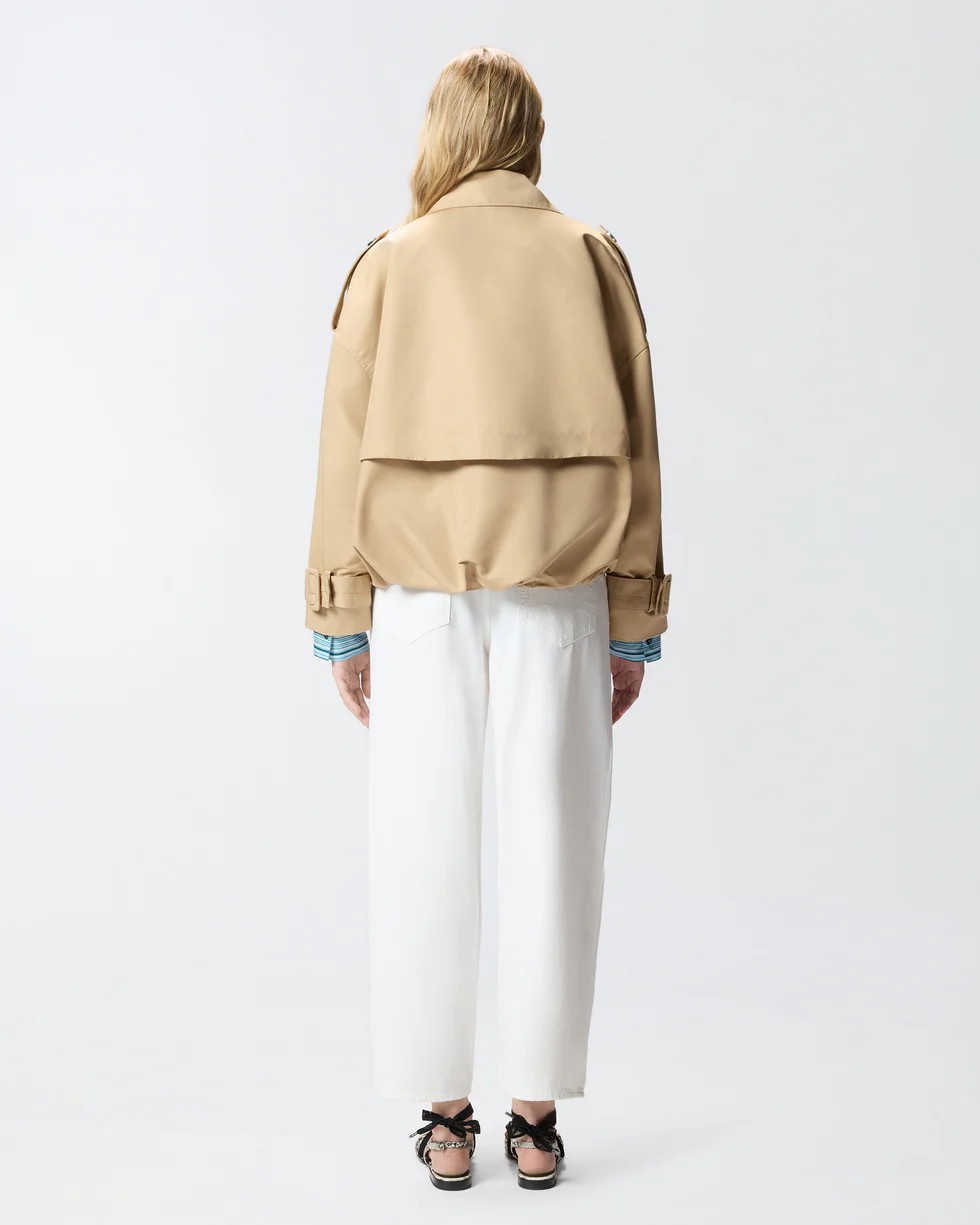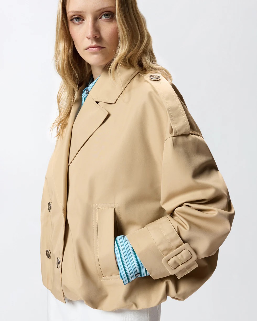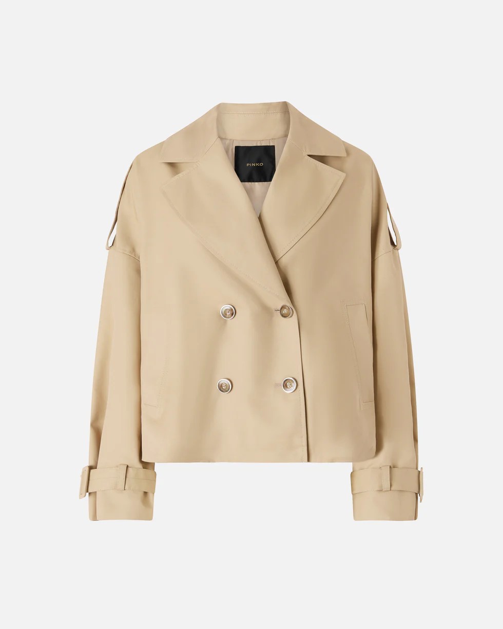 Il trench, capo primaverile per eccellenza, viene rivisitato in chiave PINKO con un design corto ancora più versatile. Il capo, realizzato in gabardina di misto cotone, è caratterizzato da ampi revers, spalle scese con alamari, due comode tasche laterali, polsi con cinturini e una chiusura doppiopetto. Completa il design l'elegante inserto sul retro a mantella che dona volume. Questo autentico passe-partout è pronto a seguirti dall'ufficio alle occasioni serali. - TRISCIA TRENCH