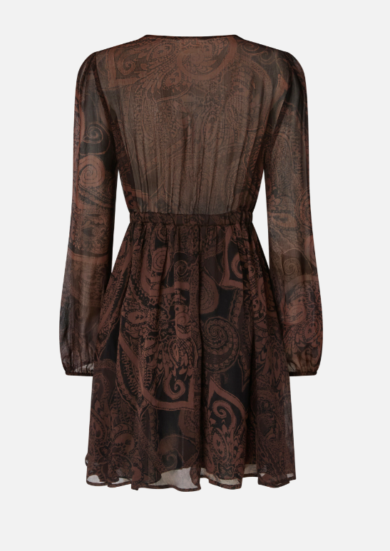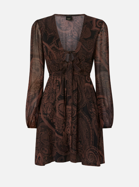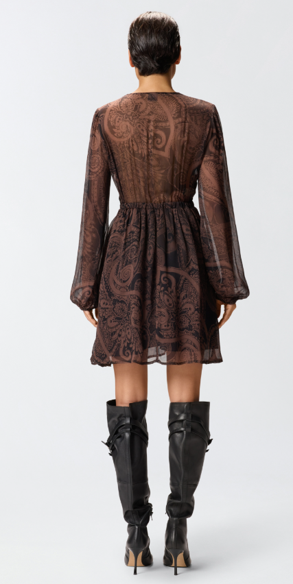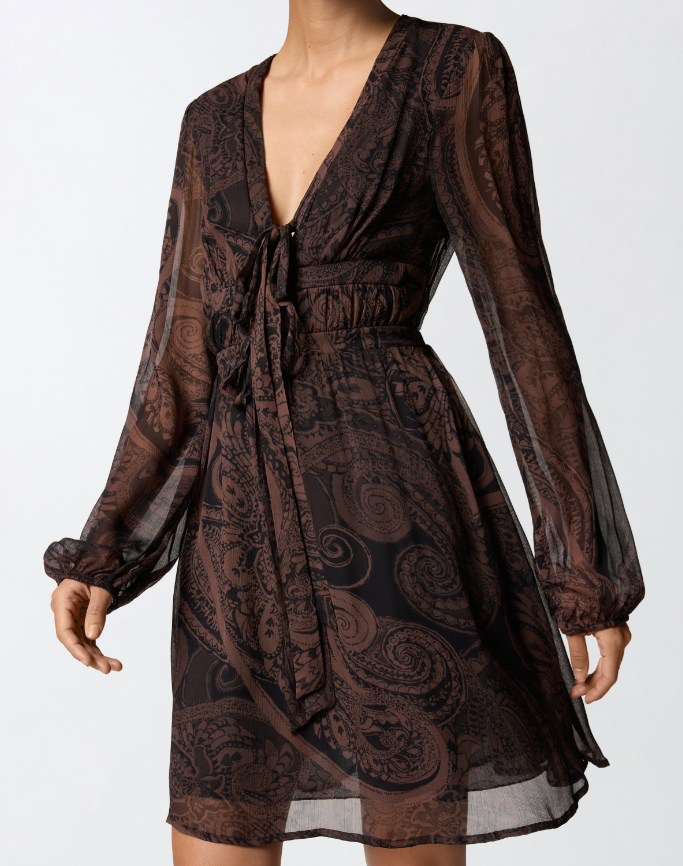 Vestito corto con maniche lunghe leggermente a palloncino e scollo a V, caratterizzato da una gonna morbida e plissettata e da un punto vita elasticizzato che valorizza la silhouette. Il modello è realizzato in leggero creponne di viscosa semitrasparente ed è arricchito da una sofisticata stampa d'ispirazione cachemire. La leggerezza e la silhouette del capo lo rendono femminile e sensuale, ma l'elemento che catalizza l'attenzione è il cut-out sul davanti creato dalle due bande di tessuto allacciate, tanto semplice quanto d'effetto.