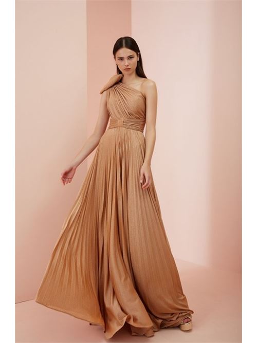 Abito corto Simona Corsellini in raso con scollo a cuore, spalle scoperte con maniche a sbuffo ed arricciatura sul davanti.
