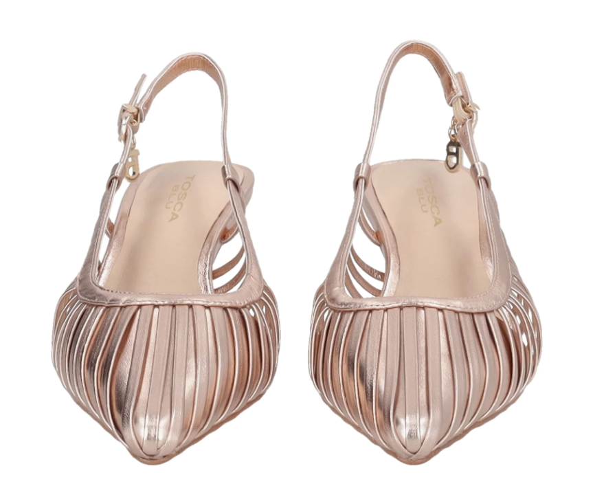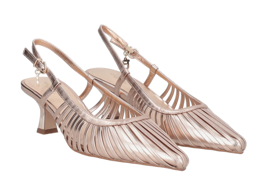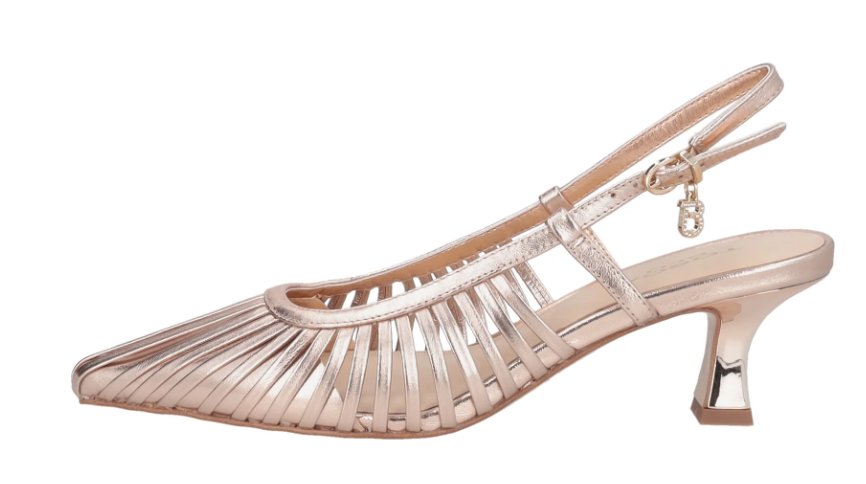 Realizzate interamente in pelle, queste slingback in vernice incantano per il sofisticato gioco di listini che avvolge il piede con eleganza. Declinato in tonalità oro rosa, il modello è impreziosito dal charm monogramma con strass che brilla ad ogni tuo passo. Il tacco medio a rocchetto e il cinturino regolabile assicurano una camminata sicura e confortevole. Perfette per una cerimonia primaverile o per elevare un look da ufficio con un pantalone a palazzo, le slingback in vernice sono il tocco di luce indispensabile per il tuo guardaroba.