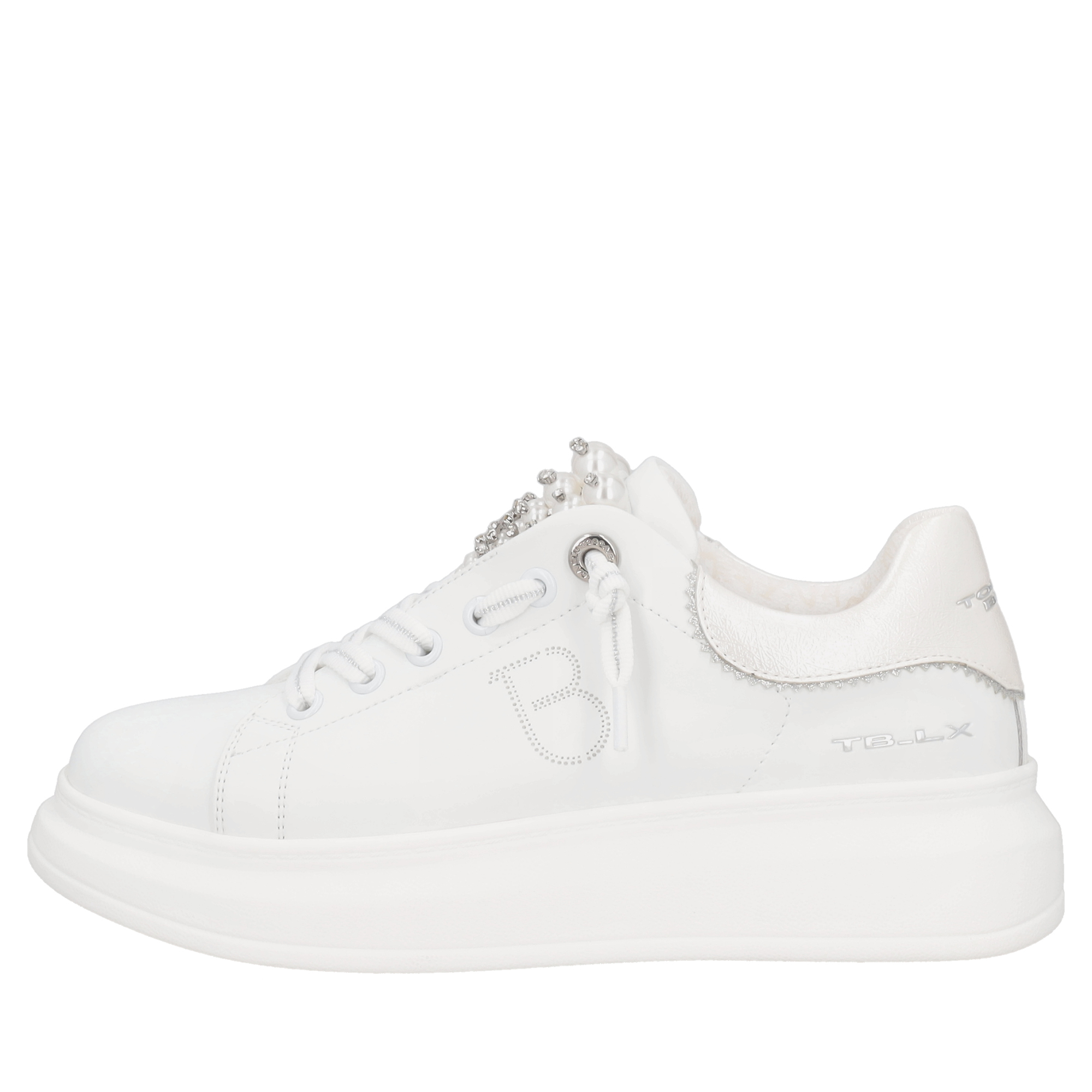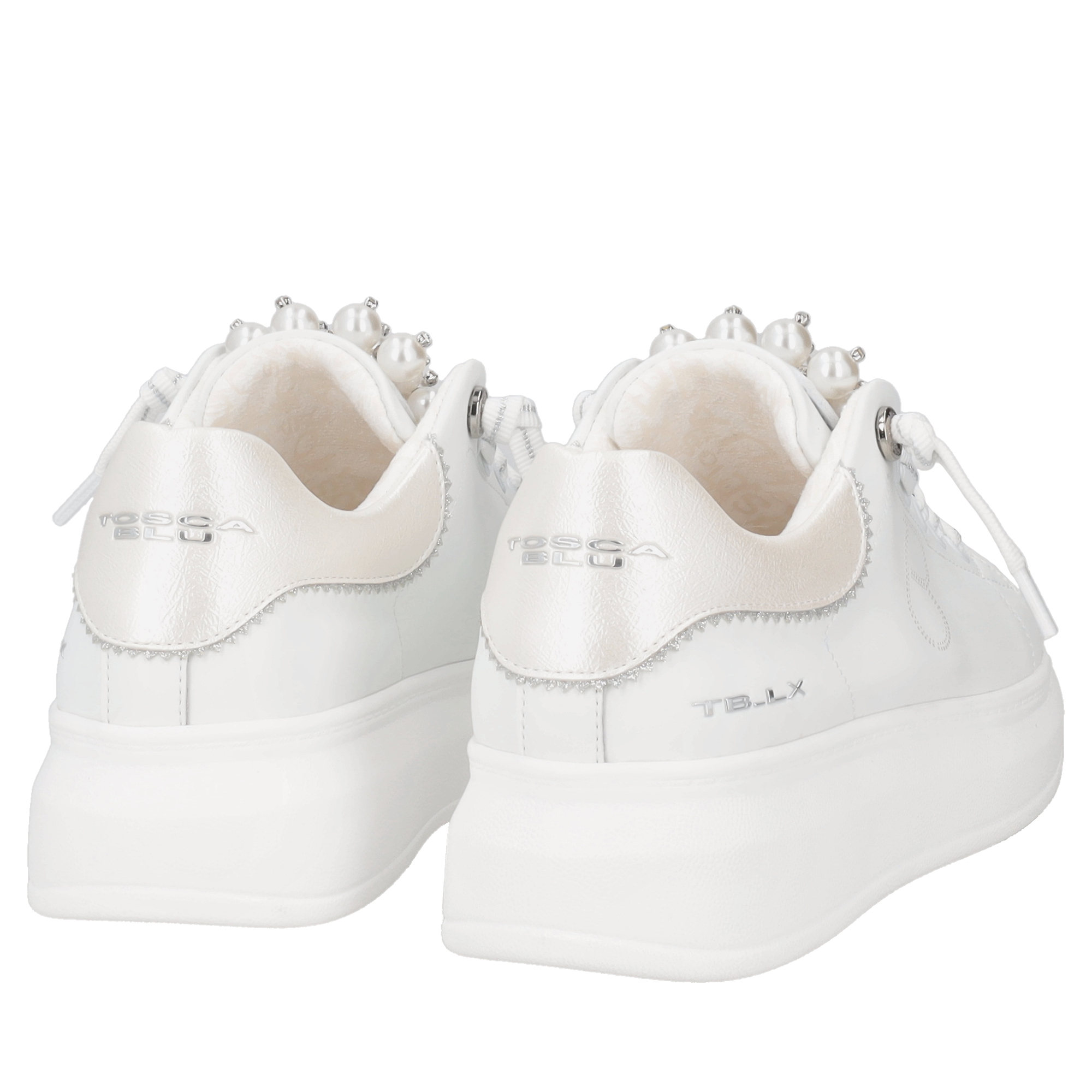 Si adatta facilmente al tuo guardaroba la sneaker in pelle bianca firmata Tosca Blu. Questo modello presenta tallone a contrasto e la linguetta arricchita da perle, dettagli glamour che conquistano al primo sguardo. La suola alta garantisce un passo sicuro e una calzata confortevole, mentre liconico monogramma è presente in versione traforata sul lato. Questa sneaker in pelle abbinala con qualsiasi outfit, dai jeans ai vestiti più formali.