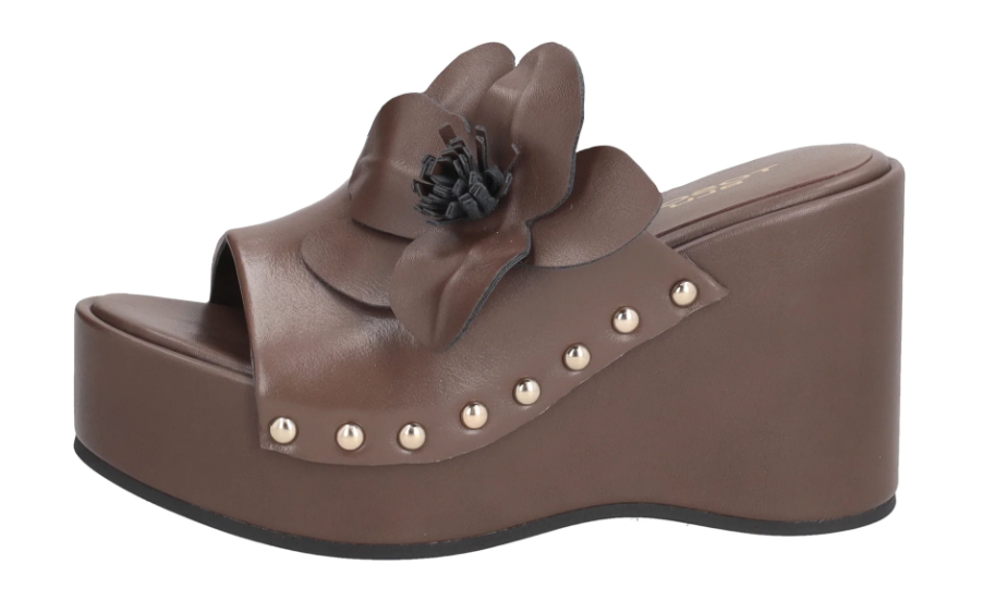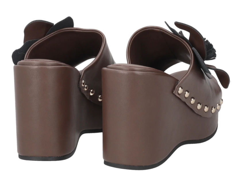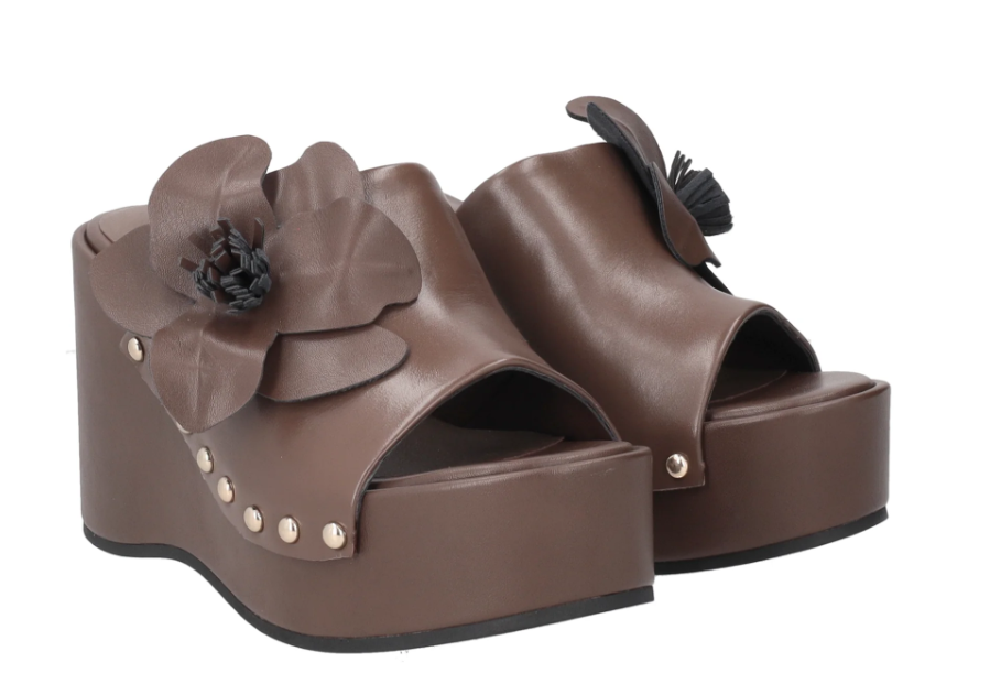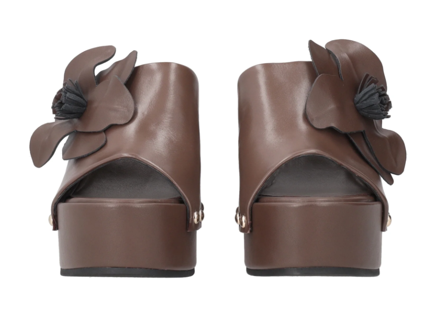 Questi sabot in pelle color testa di moro sono un vero manifesto di personalità. Il design iconico viene reinterpretato in chiave glamour grazie alla romantica applicazione floreale sulla tomaia e al profilo rifinito con luminose borchie dorate. Il tacco da 10 cm, bilanciato da una suola platform generosa, slancia la figura e assicura stabilità e comfort.
