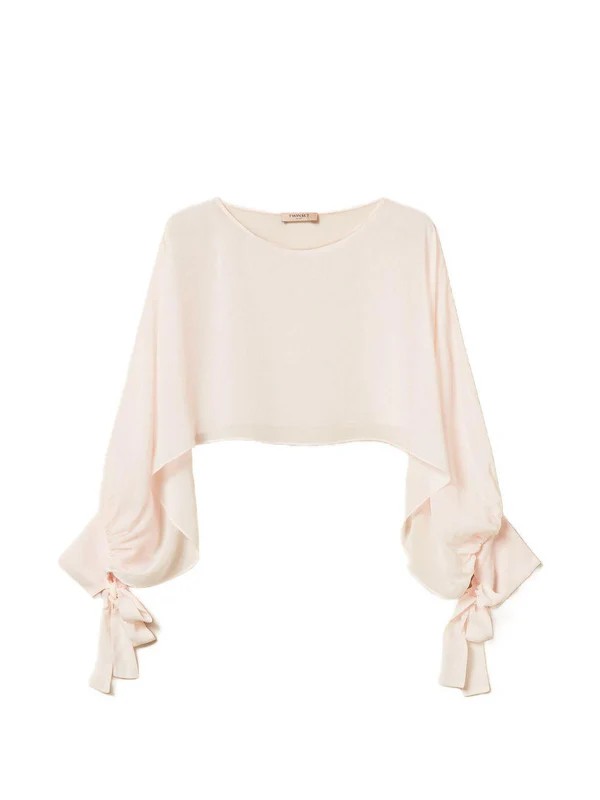 Coprispalle cropped in georgette rosa cipria di Twinset caratterizzata da collo rotondo, maniche lunghe con delicati volant e fiocco frontale che aggiunge un dettaglio femminile e raffinato. La silhouette corta valorizza il punto vita, rendendo il capo ideale per look quotidiani chic, abbinamenti con pantaloni o gonne a vita alta e outfit da giorno sofisticati, di Twinset. Un capo elegante che unisce femminilità, leggerezza e stile contemporaneo.