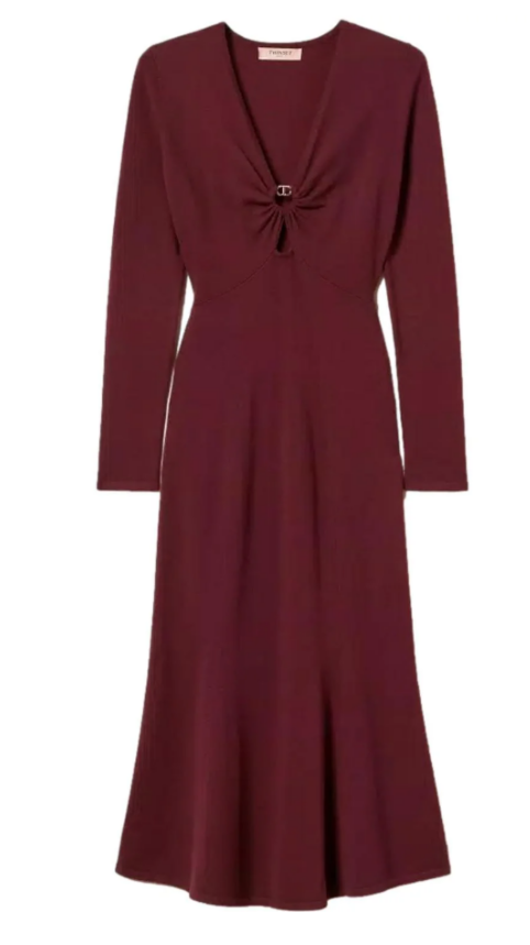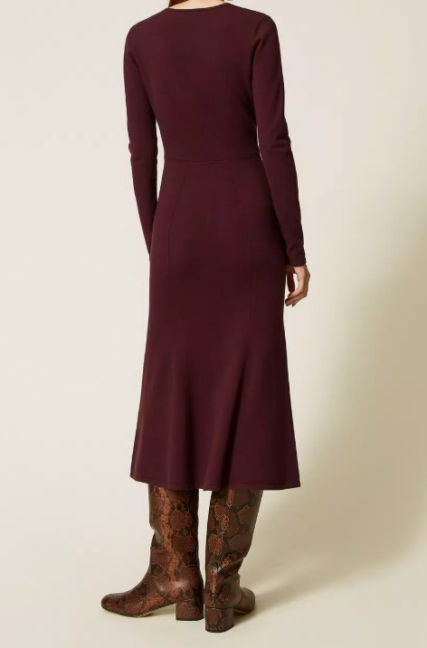 Abito longuette in maglia di misto viscosa con profondo scollo a V fermato da inserto gioiello Oval T che crea un'apertura con arricciatura centrale. Ha maniche lunghe, tagli diagonali e calature che definiscono la silhouette, linea fitted.