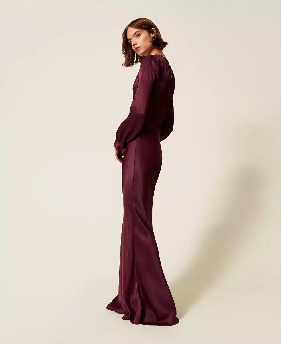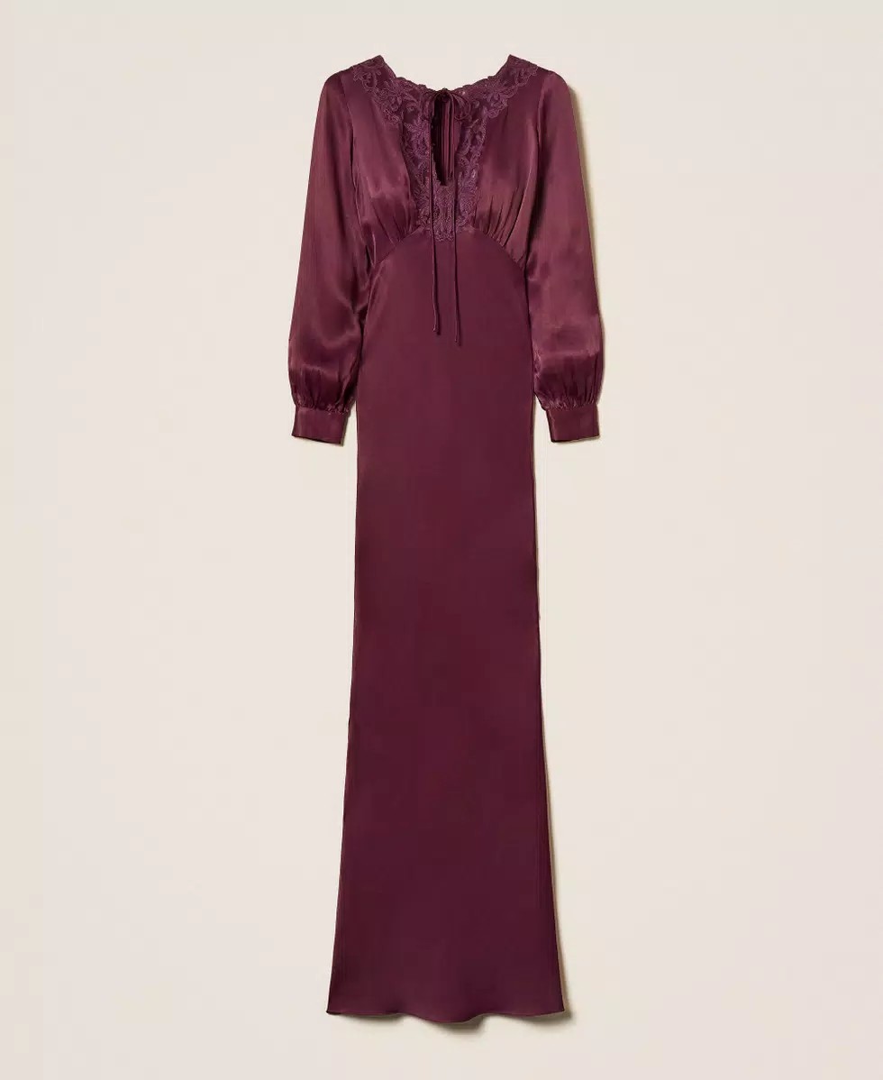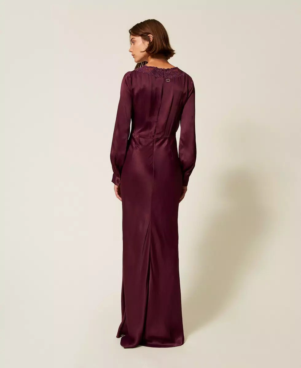 TWINSET Abito lungo in raso di viscosa con ricamo in filo intarsiato su base tulle, apertura a goccia con laccio da annodare a fiocco, maniche lunghe e chiusura con zip sul dietro.