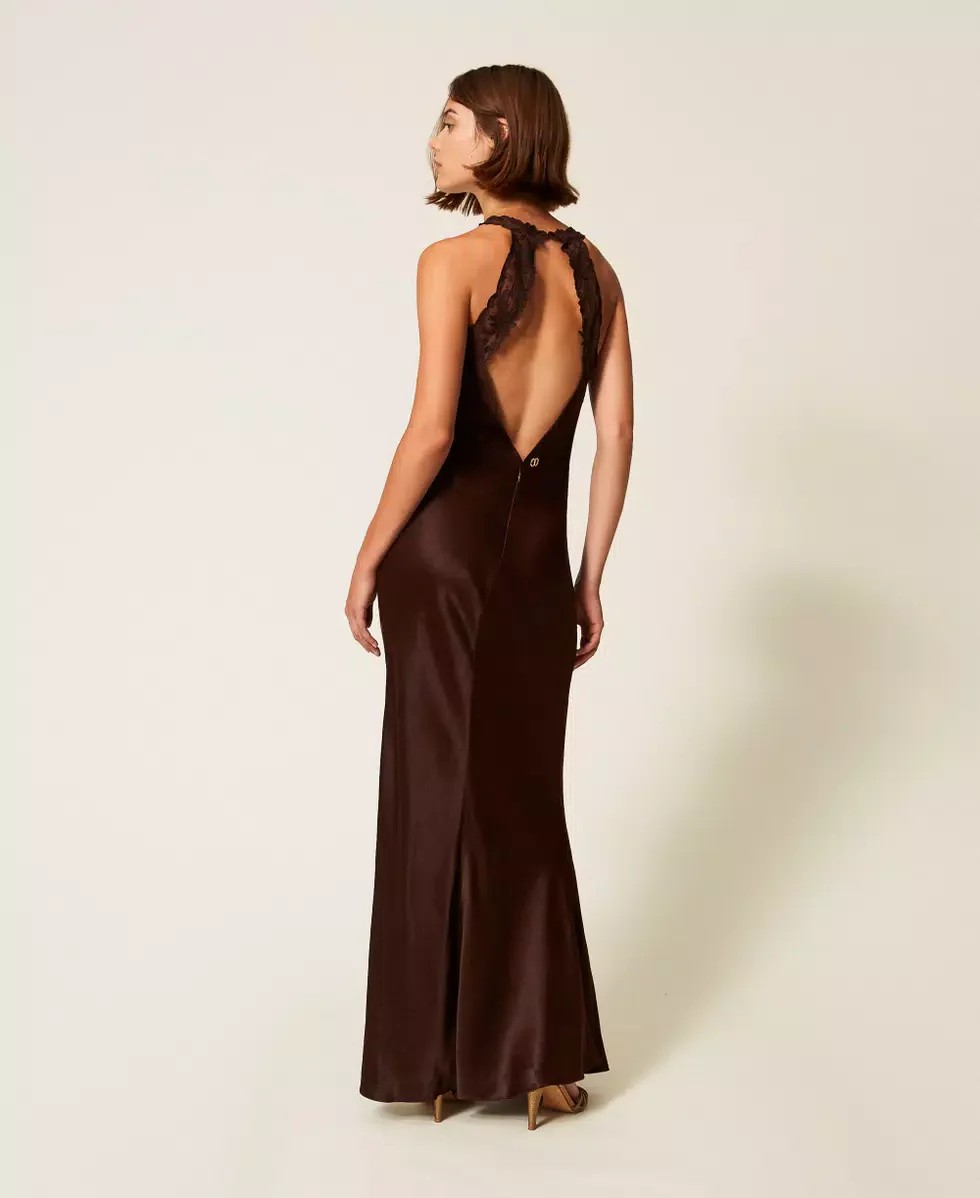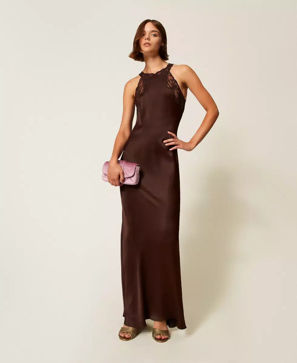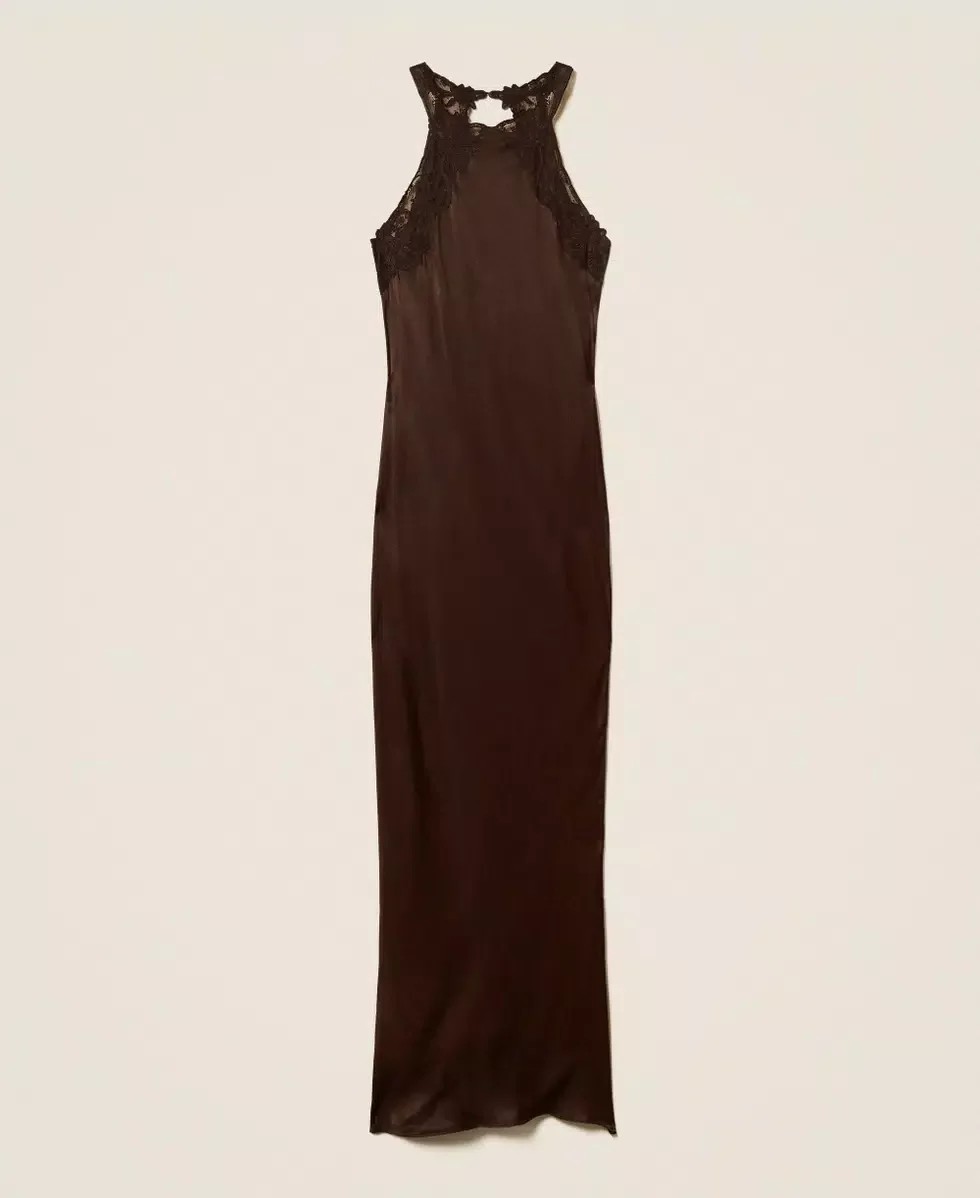 Abito lungo smanicato in raso di viscosa con scollo bordato in pizzo Twinset