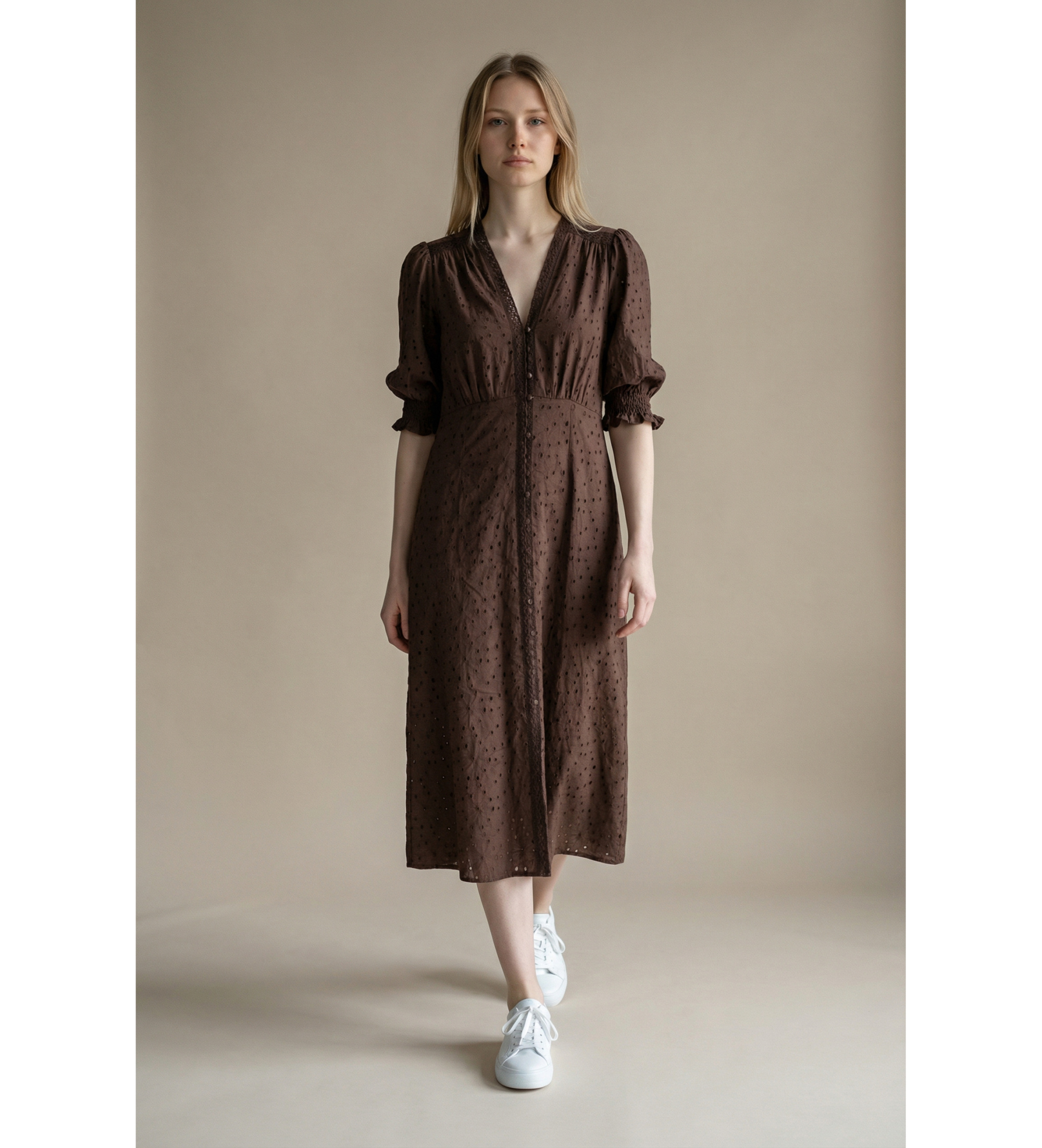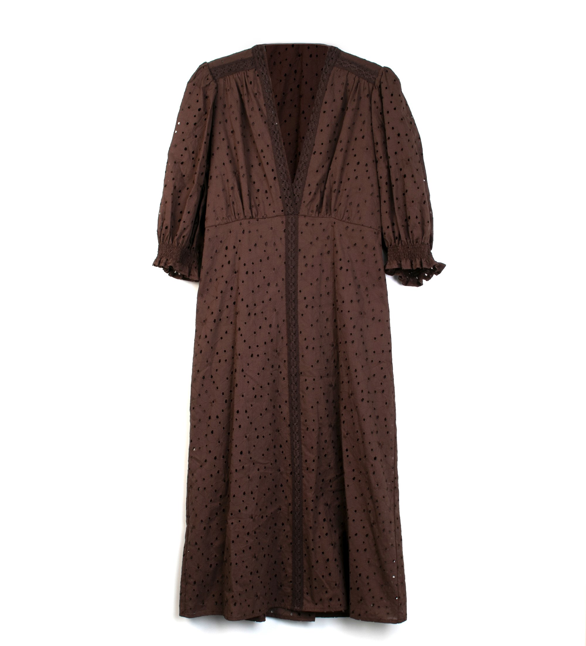 Abito midi color cioccolato di TWINSET. Realizzato in tessuto sangallo traforato, questo modello di ispirazione romantica unisce femminilità e raffinatezza a un'eleganza sobria e senza tempo. La vita definita e le maniche a sbuffo lo rendono un capo d'effetto, perfetto sia per il giorno che per le serate speciali.