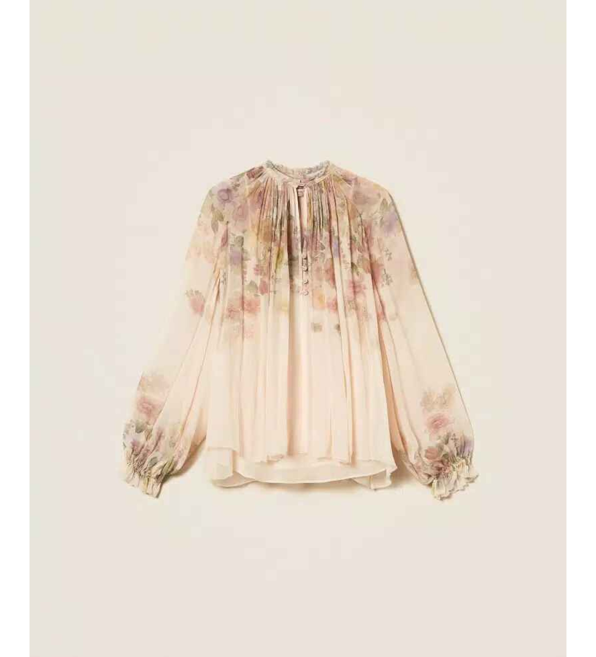 Blusa in creponne di viscosa con stampa piazzata a fiori in dégradé, disegno esclusivo Twinset. Ha collo tondo, apertura a goccia con bottoni, maniche lunghe con elastico al fondo e volant, top con spalline sottili abbinato, linea ampia.