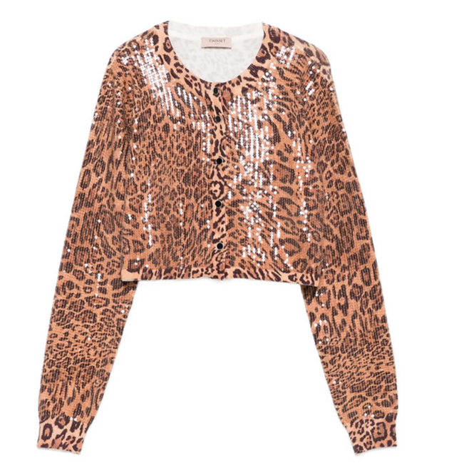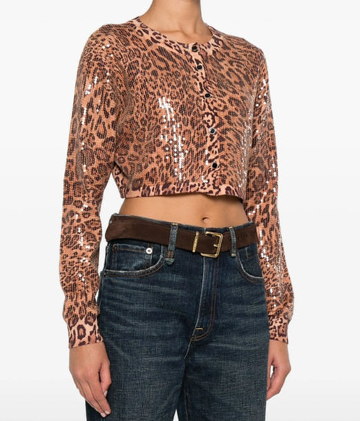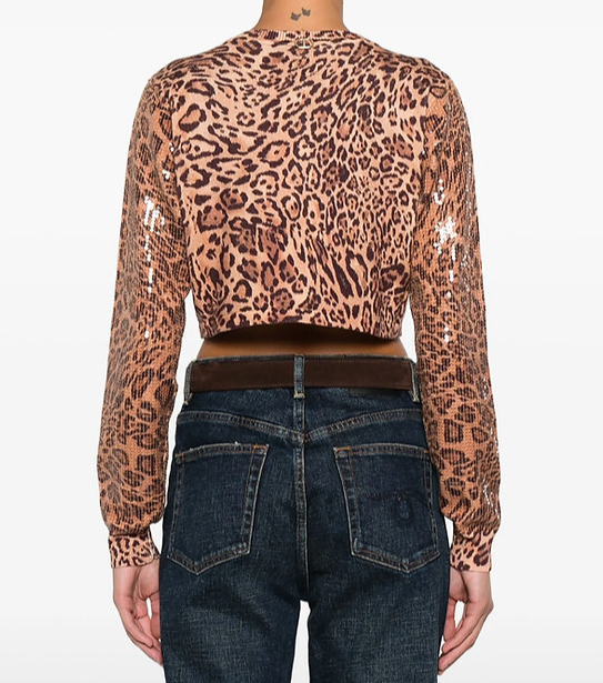 Cardigan cropped animalier con paillettes, chiusura con bottoni, maniche lunghe e orli a coste.