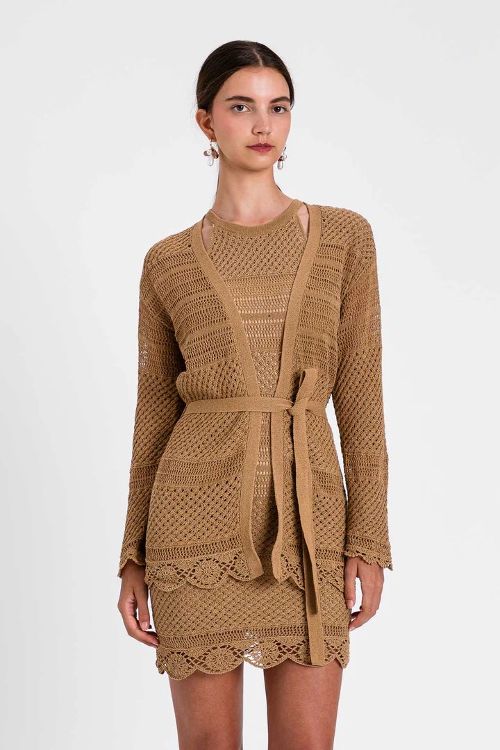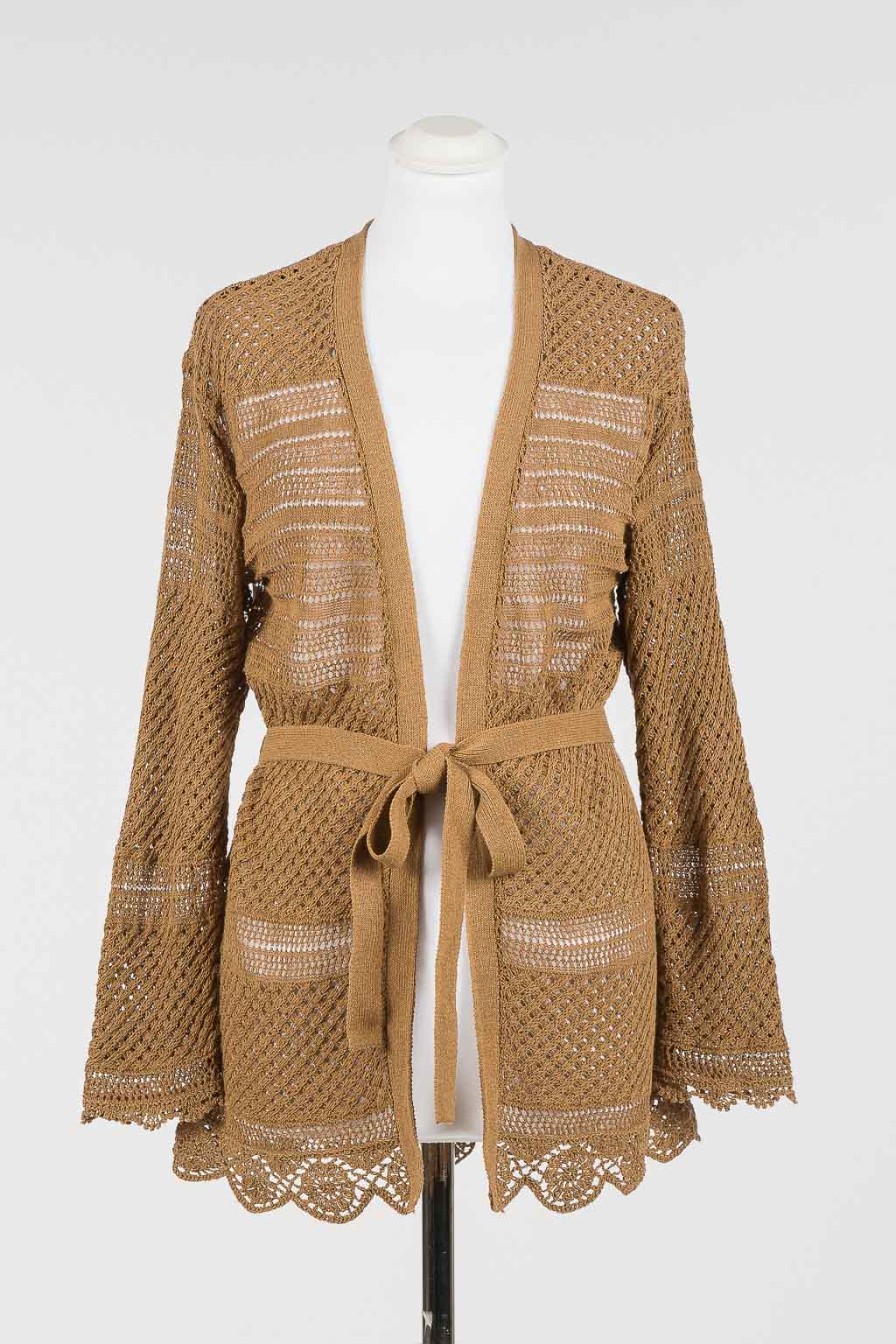Twinset Cardigan con cintura in maglia traforata e crochet con applicazioni di piccoli strass.