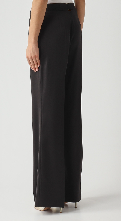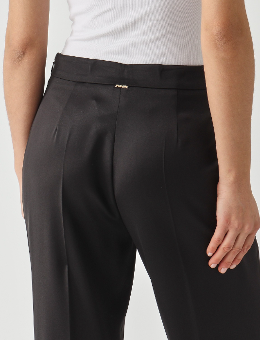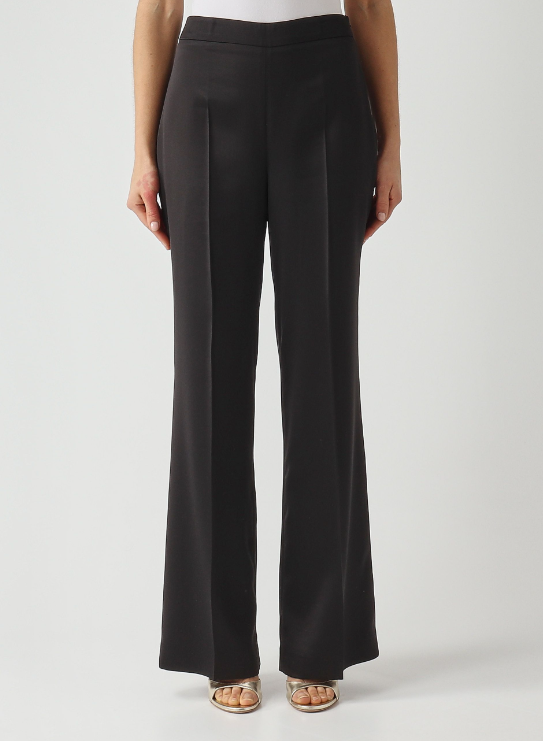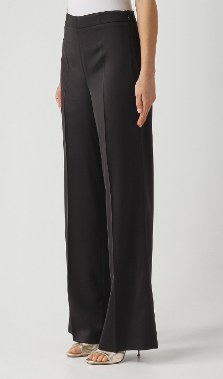 Questi pantaloni dal carattere elegante e contemporaneo hanno una linea a vita alta, con una gamba che scende fluida e pulita per un effetto slanciato e sofisticato. Il design essenziale è arricchito da dettagli discreti, come la chiusura con zip invisibile e la piega stirata. Il tessuto regala una superficie liscia e leggermente satinata, capace di riflettere la luce con delicatezza. Al tatto risulta morbido e setoso, fresco sulla pelle e piacevolmente scorrevole.