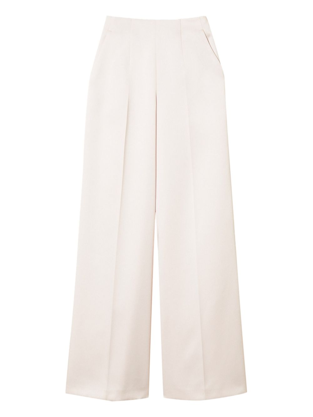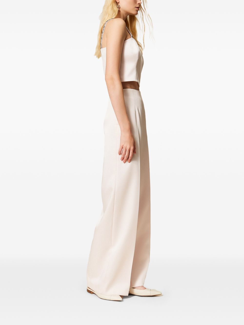 Pantalone palazzo Twinset, realizzato in duchesse, piega stirata sul davanti, chiusura con zip sul fianco, tasche laterali, 87% poliestere, 13% viscosa