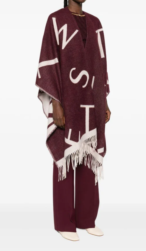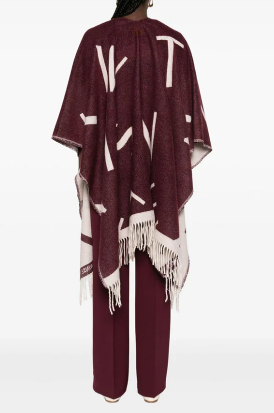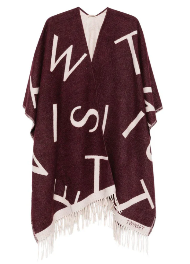 Poncho in misto lana Twinset, caratterizzato da logo all-over e frange. Un capo di outerwear di lusso che unisce calore, comfort e l'iconico stile Twinset, ideale per look versatili e sovrapposizioni eleganti.