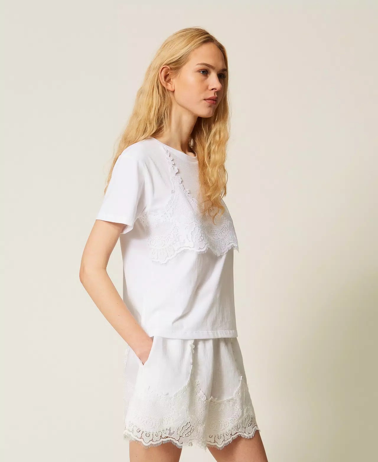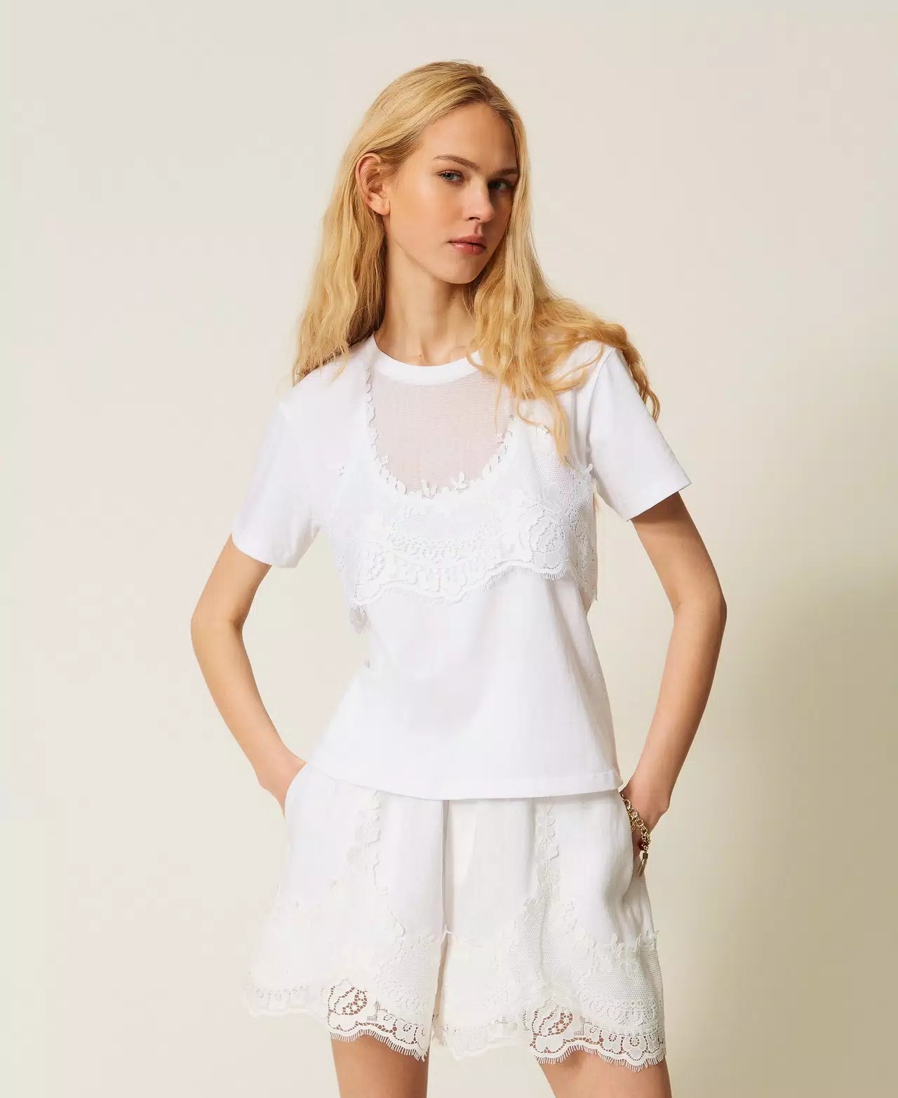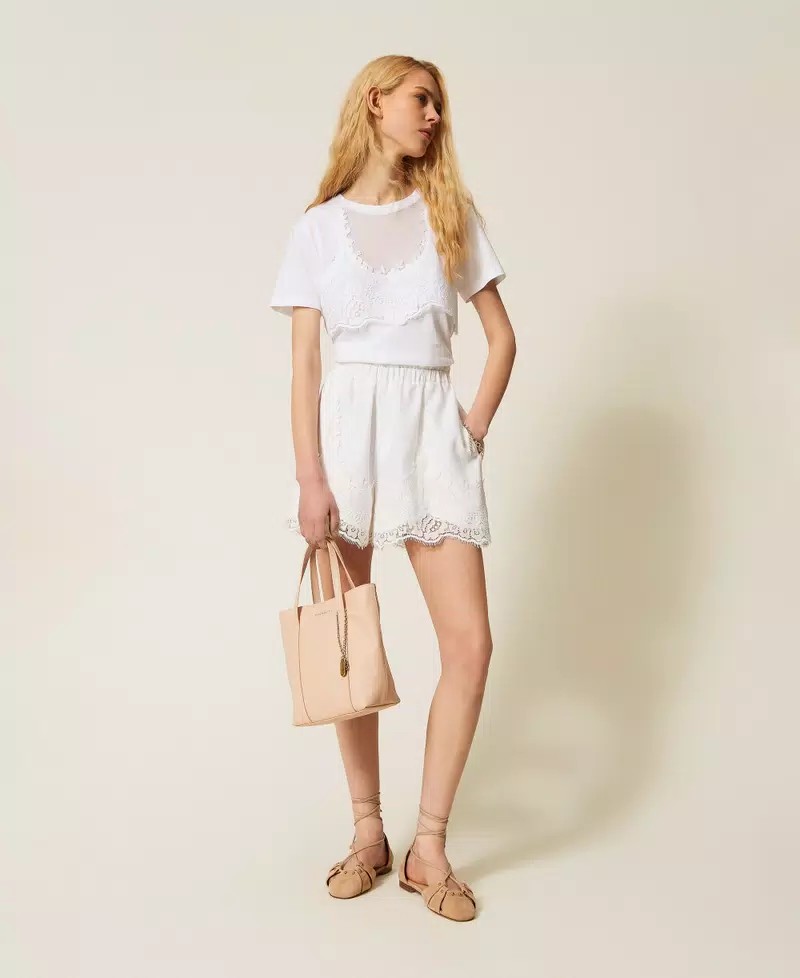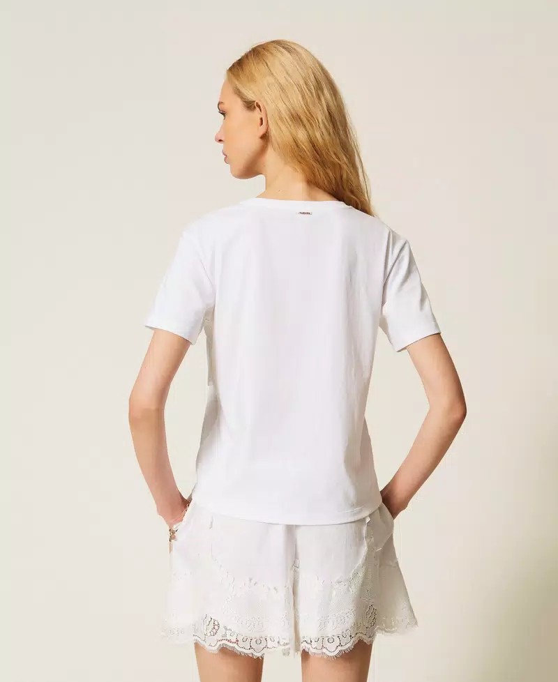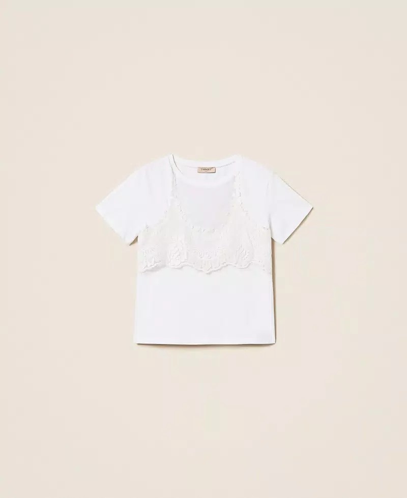 T-shirt in jersey di cotone trompe loeil con inserto in pizzo e rete sovrapposto effetto top. Ha collo tondo, maniche corte, linea regular.
